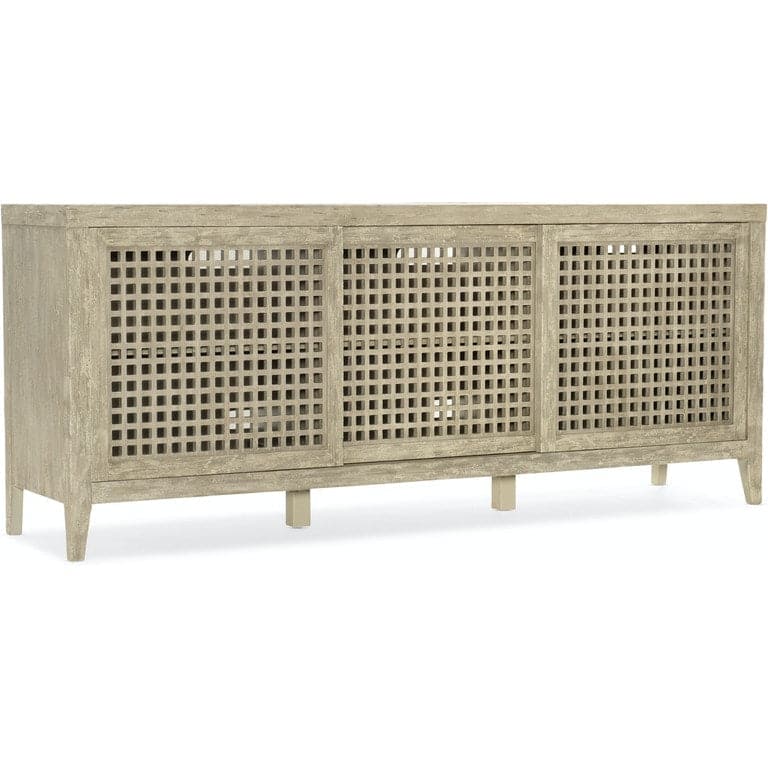 With a romantic French laundry and Shabby Chic appeal, the Cia Bella Entertainment Console will star in your family room with its Flaky White finish with hand wire brushing over light and airy perforated doors. Crafted of Poplar and Hardwood Solids with Maple Veneers, the console has 3 sliding doors with one adjustable shelf behind each door, a ventilated back panel, 3-plug outlet and accommodates up to an 80- inch TV. Inspired by the small farmhouses that dot the French and Italian countryside and have been in the hands of the same family for generations, Hooker Furniture introduces the rustic Ciao Bella Collection. The whole home collection is an eclectic mix of European farmhouse pieces that have the appearance of furniture that has been refinished multiple times as it has passed through the generations. Ciao Bella includes bedroom, dining room, occasional, home office and accent furniture, and features a finish called Timeworn Gray that accentuates the historical nature of European farmhouses - many of which include a variety of furniture styles that have been added by each generation of owners.