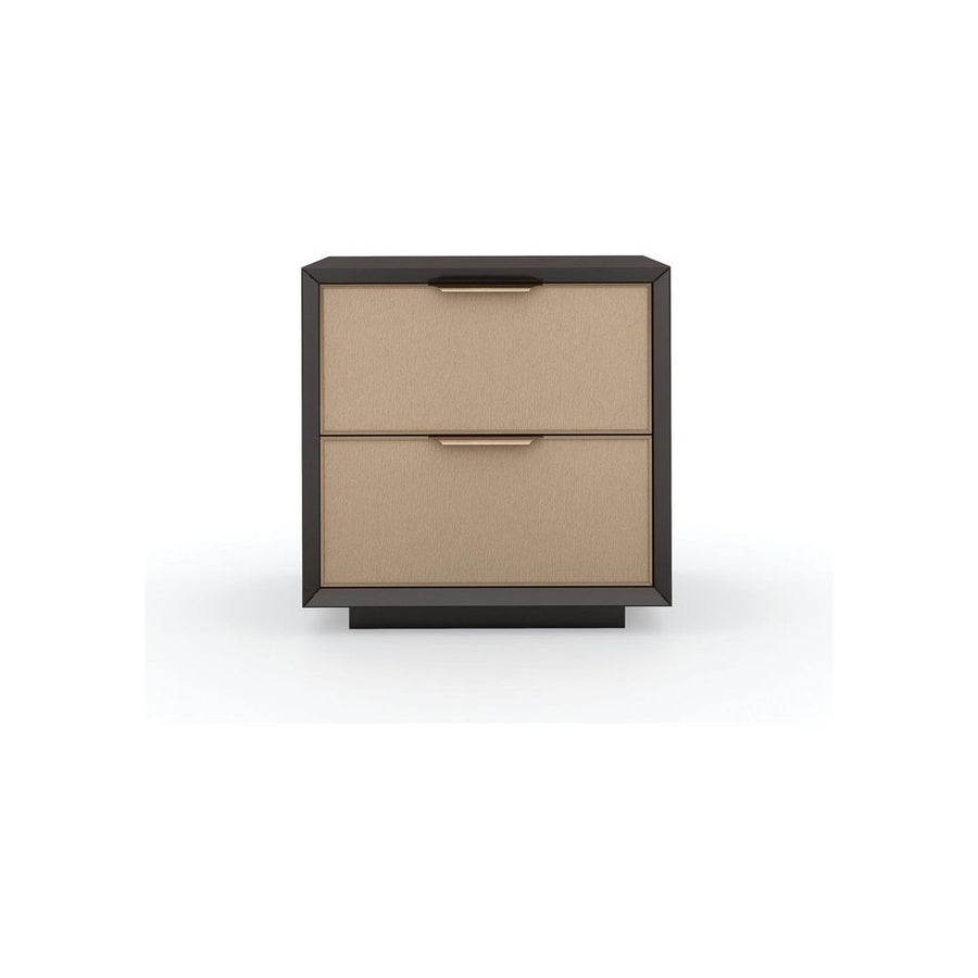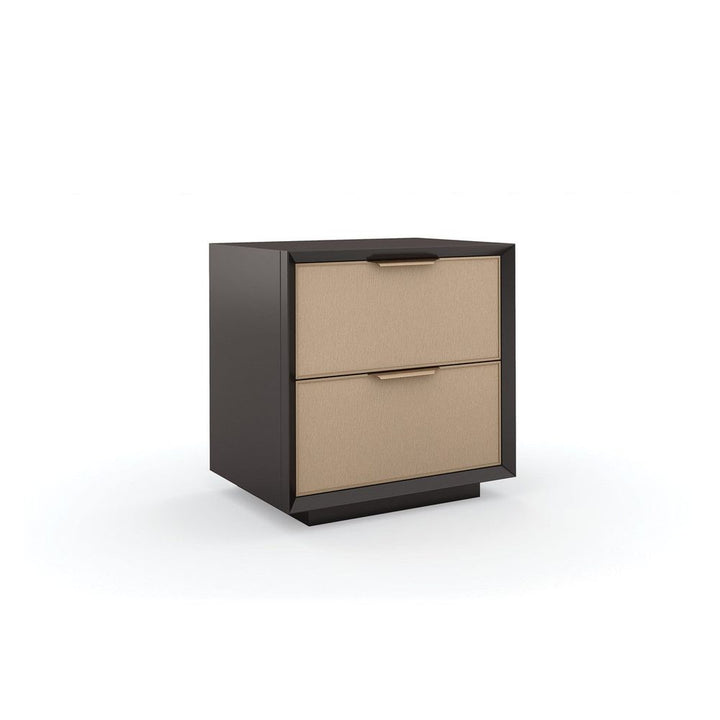 Euro-modern inspired bedside storage introduces a refined mix of materials and finishes. Encased in Dark Chocolate, two deep drawers feature durable vinyl fronts, embossed in a rivulet pattern reminiscent of rain trickling down a windowpane. Champagne Gold drawer pulls and metal trim add warmth and an artful accent. Balanced on a plinth base, this clean-lined design works well in living and bedroom interiors.