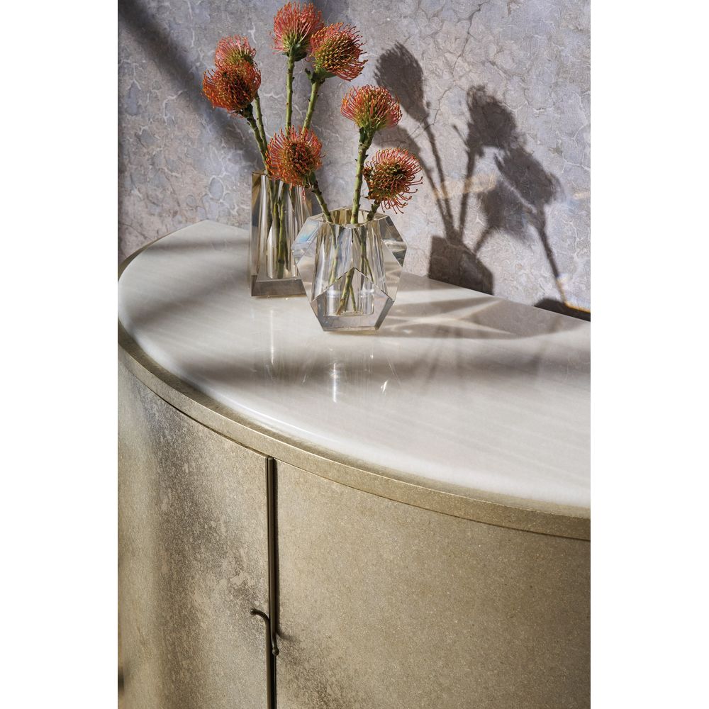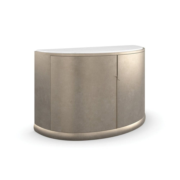 With a classic demilune shape, this shimmering chest elegantly intersects form and function. Simple yet eye-catching, its hardware is reminiscent of a vintage purse clasp-an artful reflection of its subtle sense of movement, which is enhanced by a Sunrise Frost leaf finish. Features a luxe yet durable stone top and a spacious interior with adjustable shelves for added function and tucked-away storage.