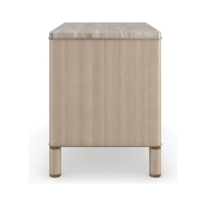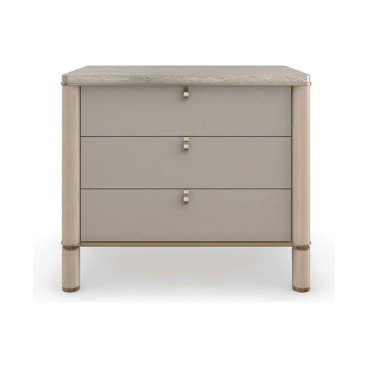 A quietly alluring bedside companion, this nightstand exemplifies balance in material and form. Features soft-to-touch, vinyl wrapped drawers, complemented by Silver Platano wood veneers and a polished travertine stone top. Metal accents and a base in Lucent Bronze add warmth and subtle contrast.