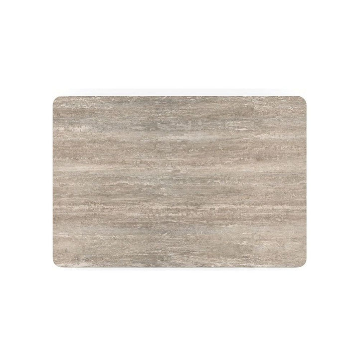 Features: Silver Travertine stone top.Case finished in Cremini.Three drawers with vinyl wrapped fronts and soft close side guides.Metal trim in Lucent Bronze Metallic.Drawer interiors in UV Mushroom.Wire management access.Top is natural stone. Natural variations in color, veining and spotting will vary from piece to piece.