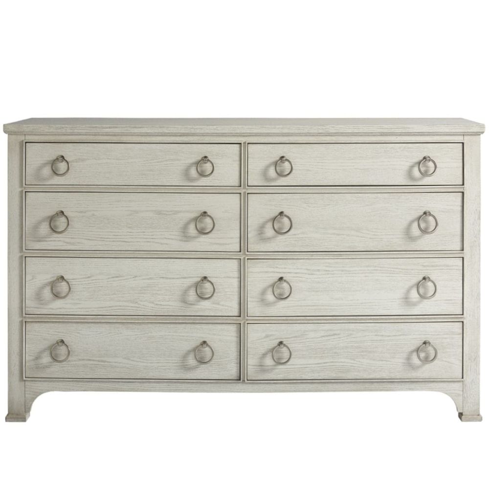The Escape Drawer Dresser features eight spacious drawers accented with complementing pairs of silver ring pulls.