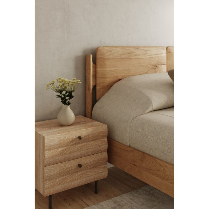 Description: The Estelle Nightstand combines soft, geometric forms with warm, modern materiality. 2 undulating, solid FSC certified Oak drawer fronts conceal generous storage drawers with a cerused finish. Sturdy steel legs and drawer hardware complement the modern organic styling of this piece.