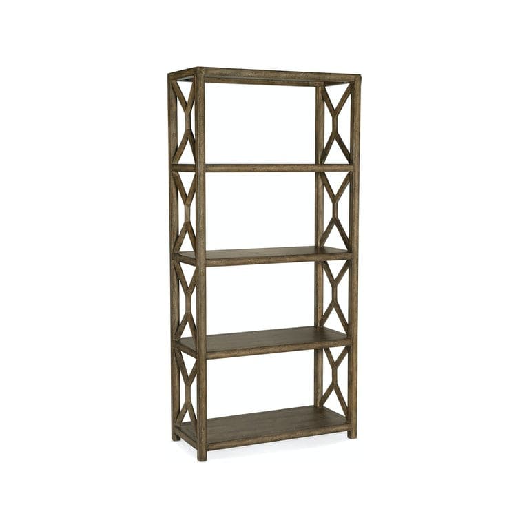 Create a resort-inspired retreat with the Sundance Etagere, featuring a wood frame crafted of Pecan Veneers finished in the rich brown Cliffside with light burnishing on the edges. The laid-back vibe of this California casual-inspired piece is enhanced by geometric fretwork on the sides of the four fixed shelves. Calling on inspiration from the iconic Pacific Coast Highway and the picturesque Malibu landscape, Sundance presents a clearly California casual aesthetic. Featured in Cliffside, a rich, dynamic brown finish with light burnishing on the edges, the collection combines a variety of natural materials including rattan, jute rope, stone, gypsum, bamboo and driftwood motifs to present a sophisticated style that can instantly create a calming resort-inspired retreat in your very own home.