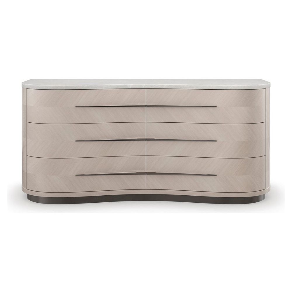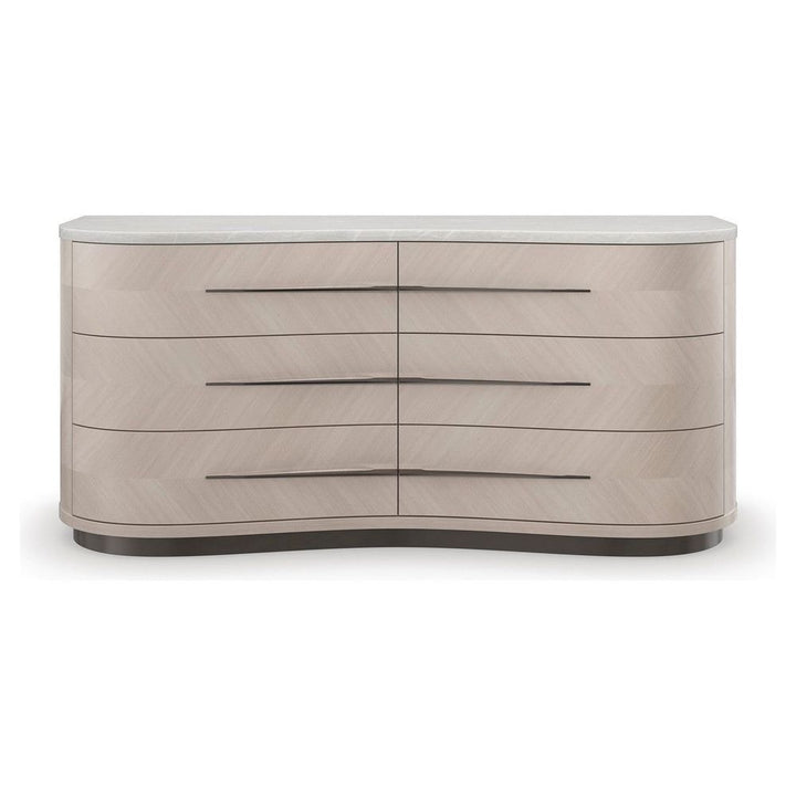Sleek and sinuous in a pearlescent Moonstone finish, this dresser introduces an elegant form with organic simplicity. Chevron-patterned Koto veneers highlight its fluidity, defined by six gently curving, soft-close drawers with horizontal hardware in a Deep Bronze finish. A White Rhino marble top adds a touch of luxe and durable top surface. With ample potential for style and storage, Roam is a naturally appealing addition to bedrooms and living interiors.