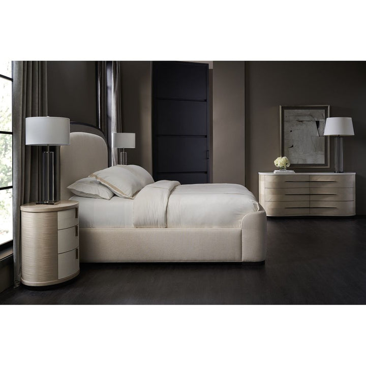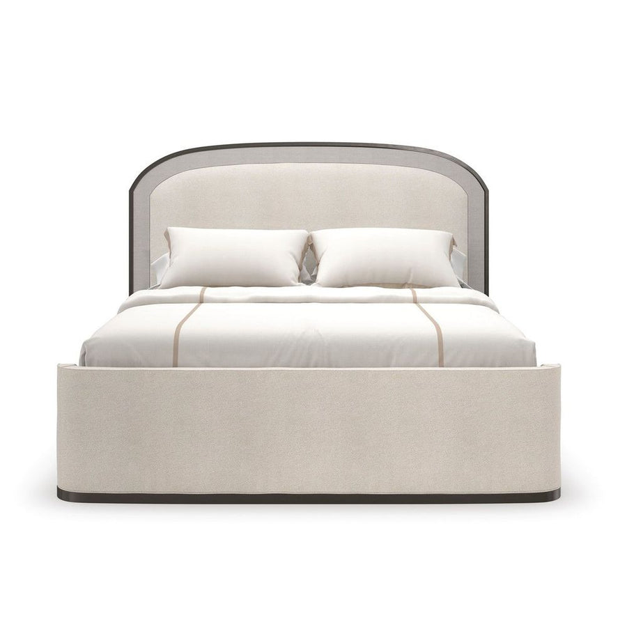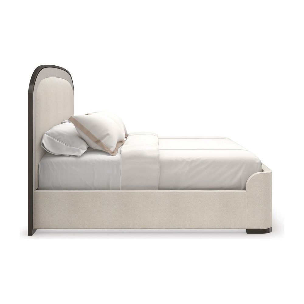 With a subtle nod to the grandeur of Art Deco, this upholstered bed introduces a harmonious mix of neutral hues, textures, and materials. Features an arched headboard accentuated with Sun-kissed Silver raffia, trimmed in Deep Bronze and wood banding in a Seal Skin finish. Elevated on a wood plinth base, its side rails and gently curving footboard are fully upholstered in an inviting, ivory textured woven.