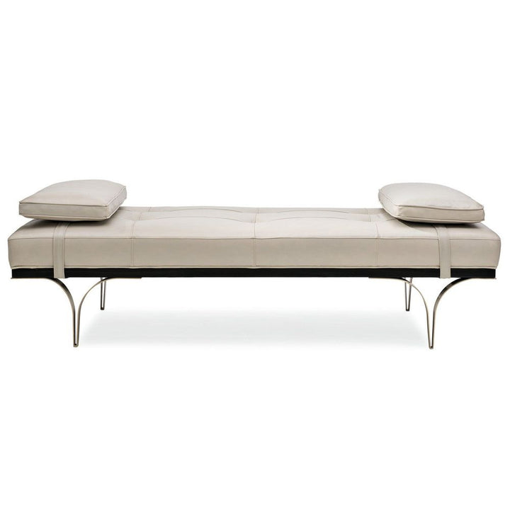 Designed for daydreaming, this daybed is truly lounge-worthy. Clean lines and elegant tailoring distinguish its appearance and are enhanced by a semi-aniline cover tufted in a modern grid pattern. A plush pillow highlights each end of this brilliant piece and can be secured or removed with ease. Metal V-shaped legs finished in Whisper of Gold elevate this daybed while lending an airy openness to its overall appearance. Designed to flatter every space, this special piece delivers a look you'll love for years to come.