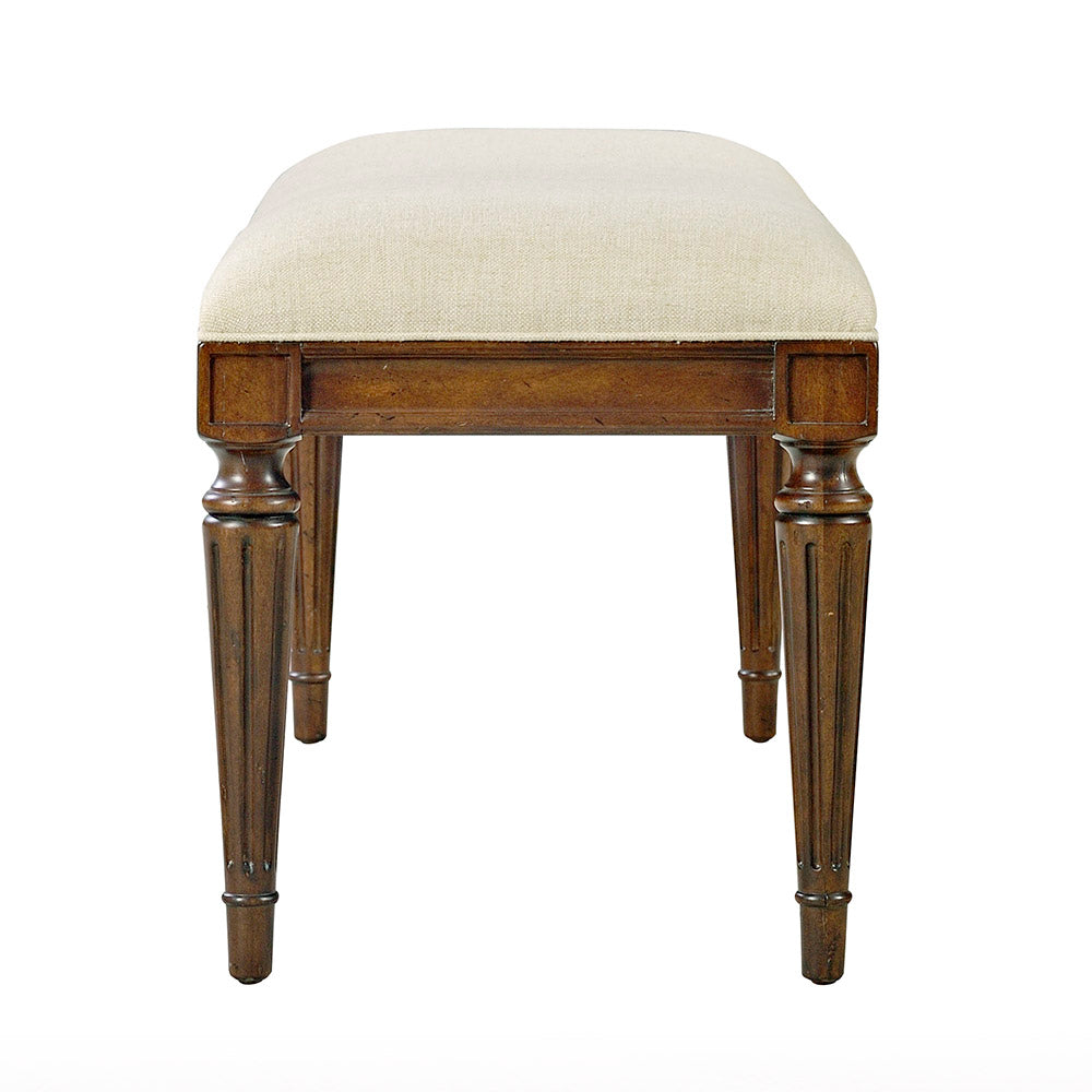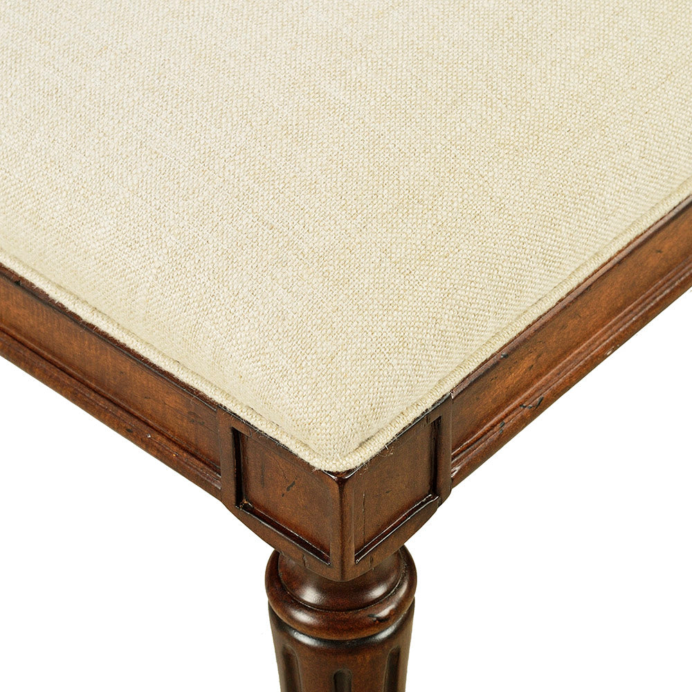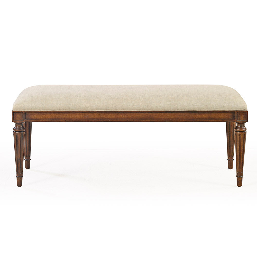 Description: Our Fairfield Bench features a drop-on upholstered seat, a shaped edge, and tapered legs; Country finish on Acacia crown veneer and solids.