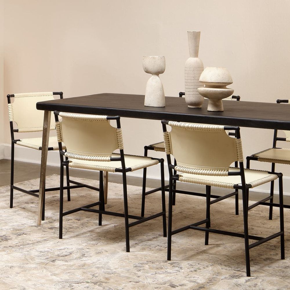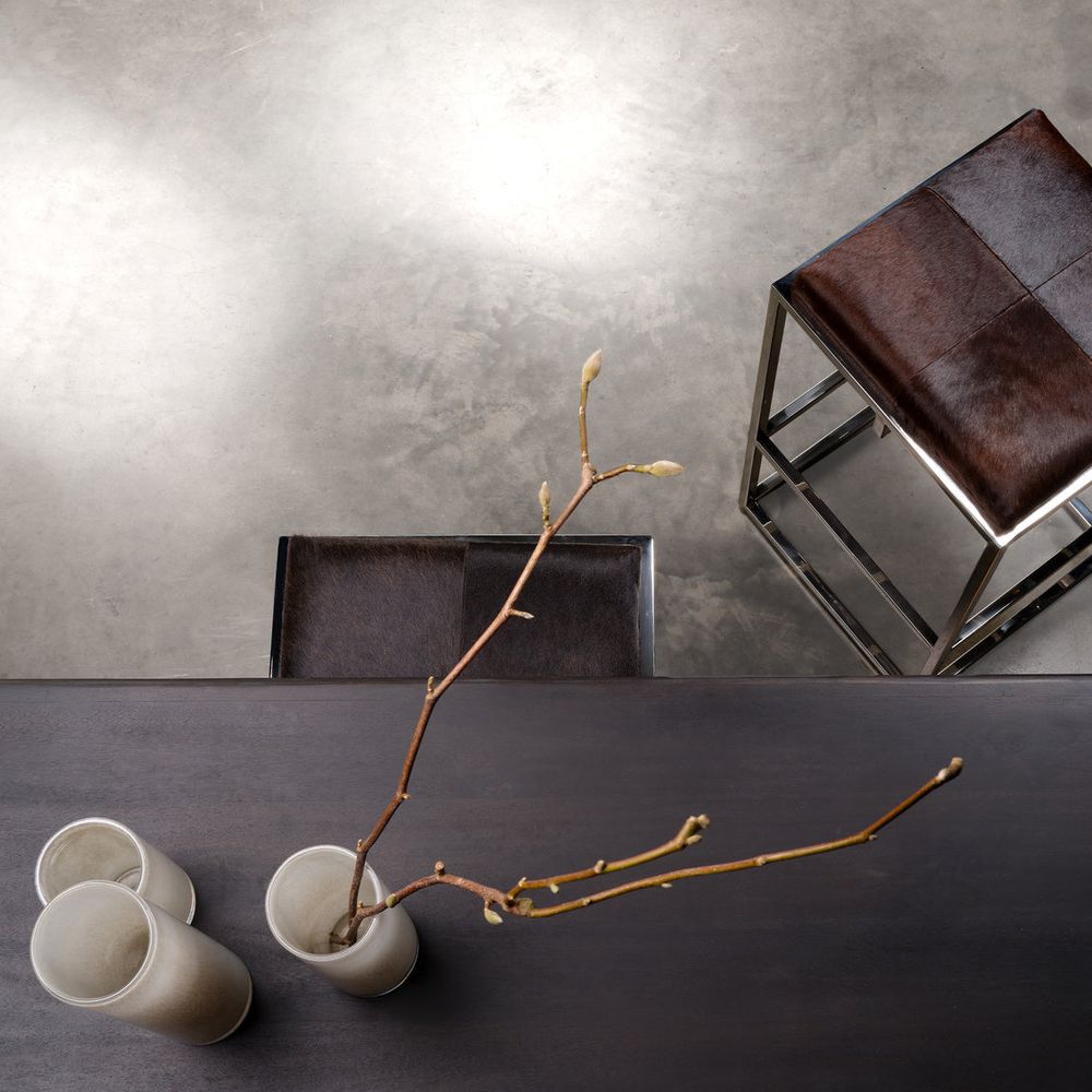 Farmhouse style hand-worked, dark wood table-tops elegantly pair with modern, hammered antique silver legs adding the perfect touch of drama to this table collection.