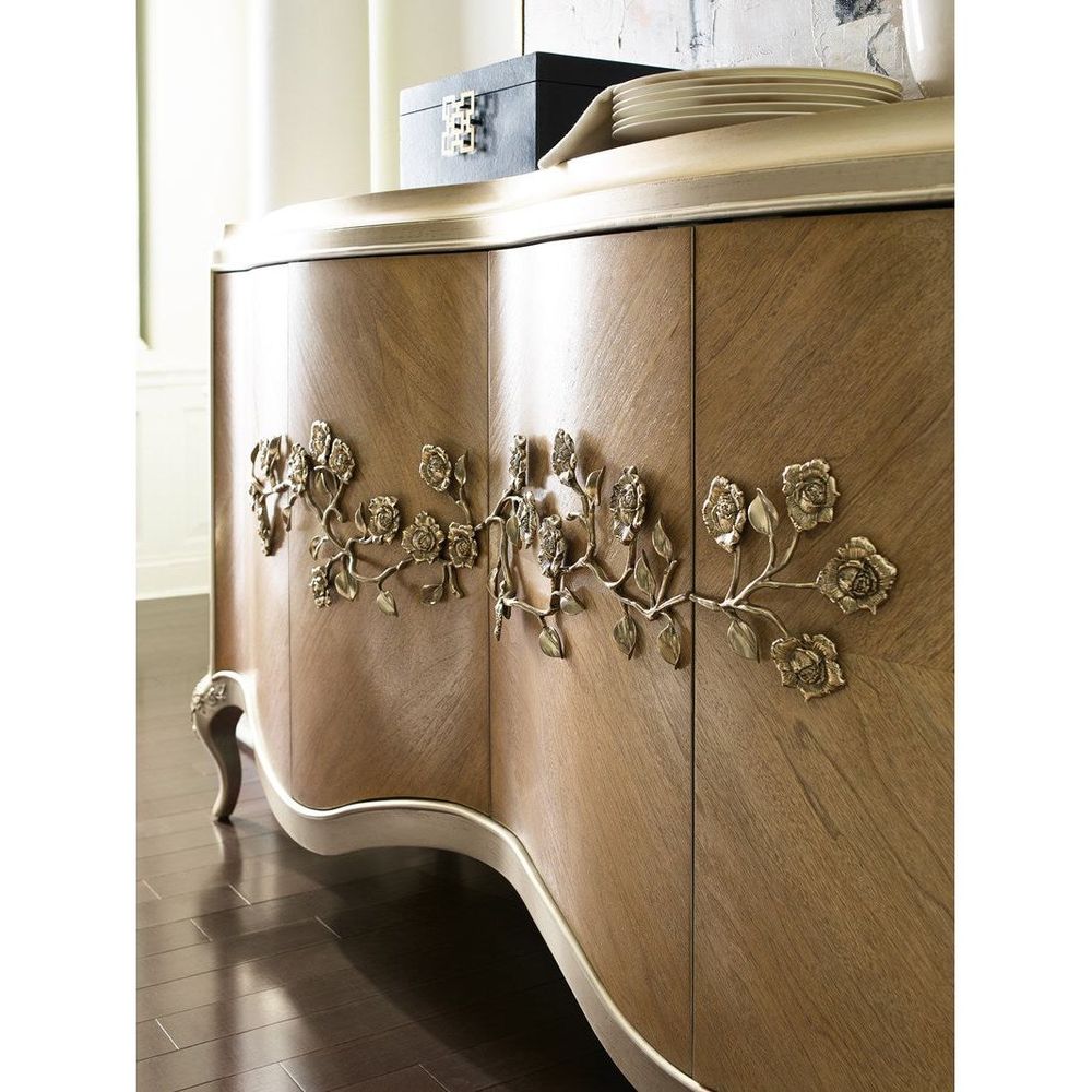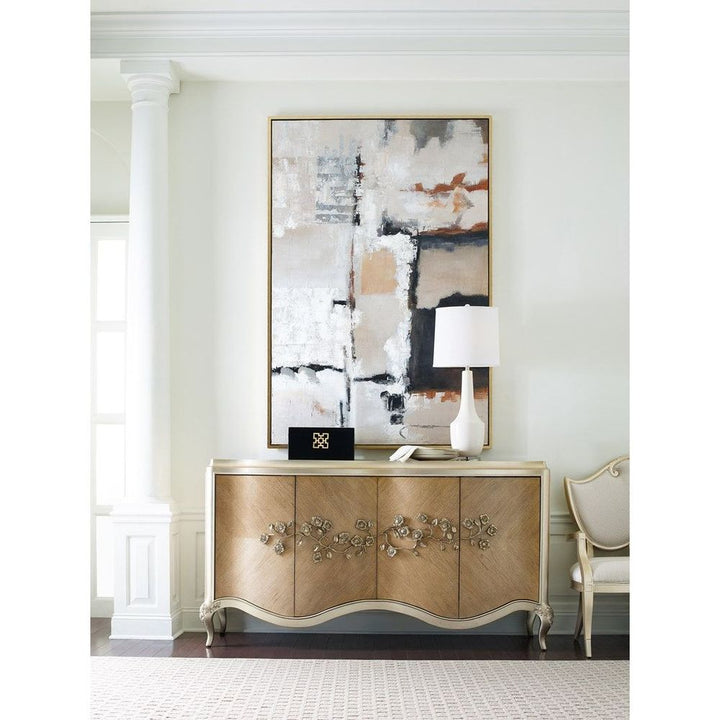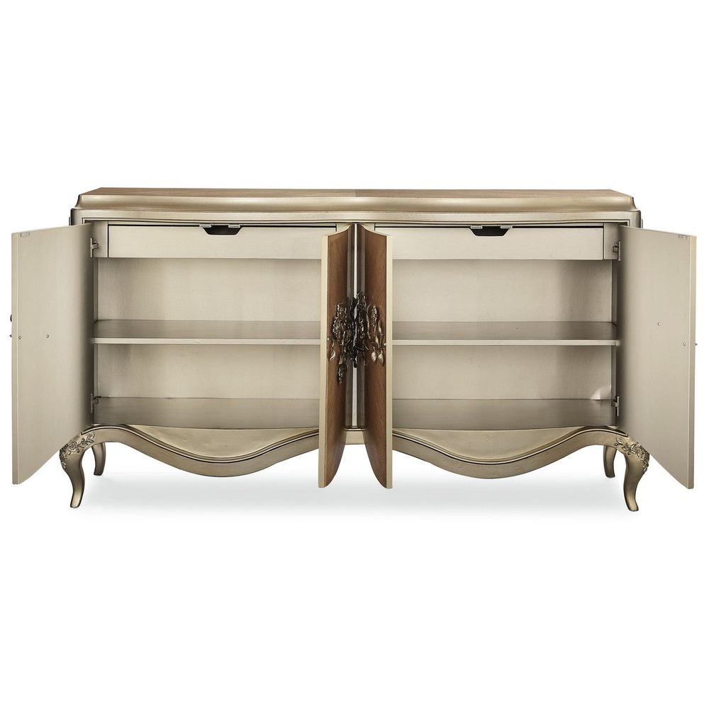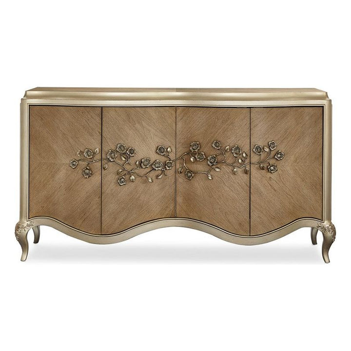 Flawlessly designed, this exquisite buffet channels the bold beauty and classic motifs of the Rococo period and interprets them for modern living. Its unique personality is brought to life with a sculptural flower and vine metal casting displayed across its shaped front. A trio of signature shades Cendre, Champagne Mist, and Aglow highlights this buffet's classic silhouette while adding depth to its veneers and carvings. The interior is finished in Champagne Mist and features a drawer and adjustable shelf behind each pair of doors. Cabriole legs with floral carvings lend a finishing touch to this fine furnishing while adding another element of Rococo-inspired character.