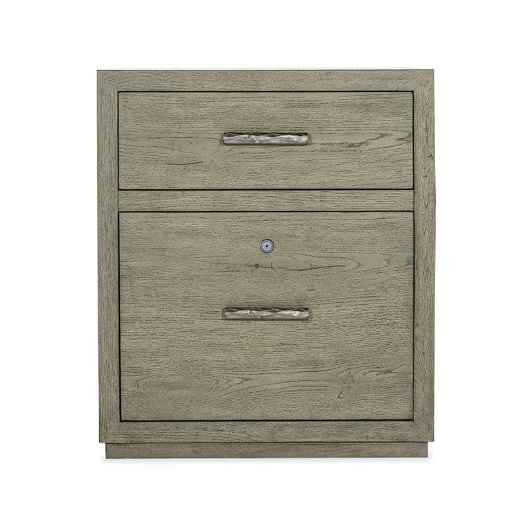 The Linville Falls File pairs the rustic weathered smoked gray Mink finish with an organic grain pattern and clean modern lines. Crafted of Oak Veneers, the File is accented with textured metal bar pulls in an antique pewter finish and features a top utility drawer and a lower locking file drawer with pendaflex filing system. Finished on the back so it can be floated in a room, it can be used alone or with coordinating modular pieces including desks, corner desks, a lateral file and etagere. Capturing the essence of nature's organic color palette and the aura of a rustic mountain cottage, Hooker Furniture introduces the Linville Falls collection. The whole home collection is designed for younger consumers looking for casual and contemporary furniture. Characterized by its rustic, weathered finish and clean lines paired with organic grain patterns, Linville Falls is constructed with split oak solids and veneers and has an overall organic aesthetic. It is featured in a soft Smoked Gray finish mixed with a Charred Black finish that is achieved through Shou Sugi Ban, a Japanese technique that creates an elegant burnt wood look. Its moderate scaling and fresh silhouettes offer a refreshing juxtaposition mixing old with new.