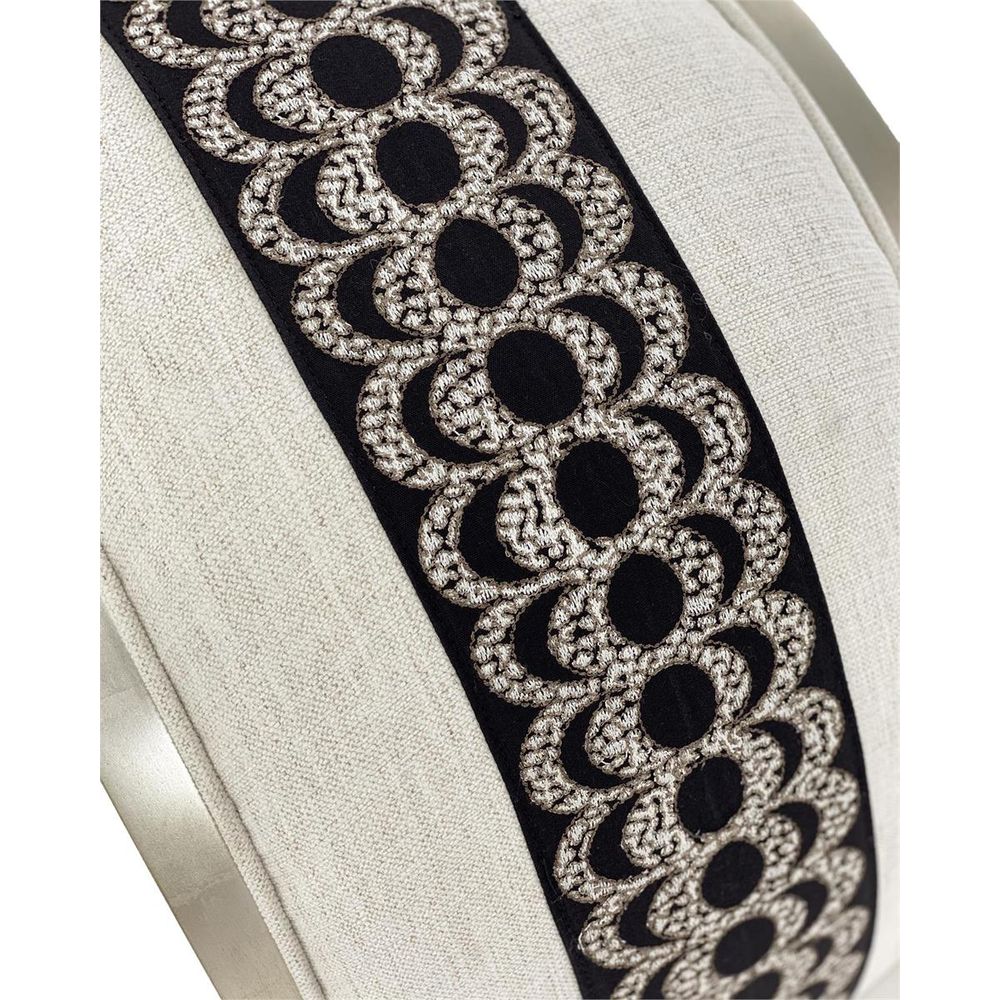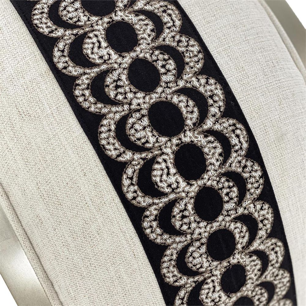 This Finn Curved Bench is in a pewter silver finish and upholstered in a neutral fabric with a center stripe the length of the bench.