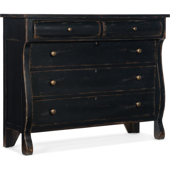 Vintage and romantic, the five-drawer bureau's softly curved front and chunky feet hearken back to a kinder, simpler time. Crafted of Poplar and Hardwood Solids with Maple Veneer, the top two drawers have a drop-in felt liner and the bottom drawers are cedar-lined. The exquisite black finish is multi-layered, with the appearance it has aged gracefully through generations. Inspired by the small farmhouses that dot the French and Italian countryside and have been in the hands of the same family for generations, Hooker Furniture introduces the rustic Ciao Bella Collection. The whole home collection is an eclectic mix of European farmhouse pieces that have the appearance of furniture that has been refinished multiple times as it has passed through the generations. Ciao Bella includes bedroom, dining room, occasional, home office and accent furniture, and features a finish called Timeworn Gray that accentuates the historical nature of European farmhouses - many of which include a variety of furniture styles that have been added by each generation of owners.