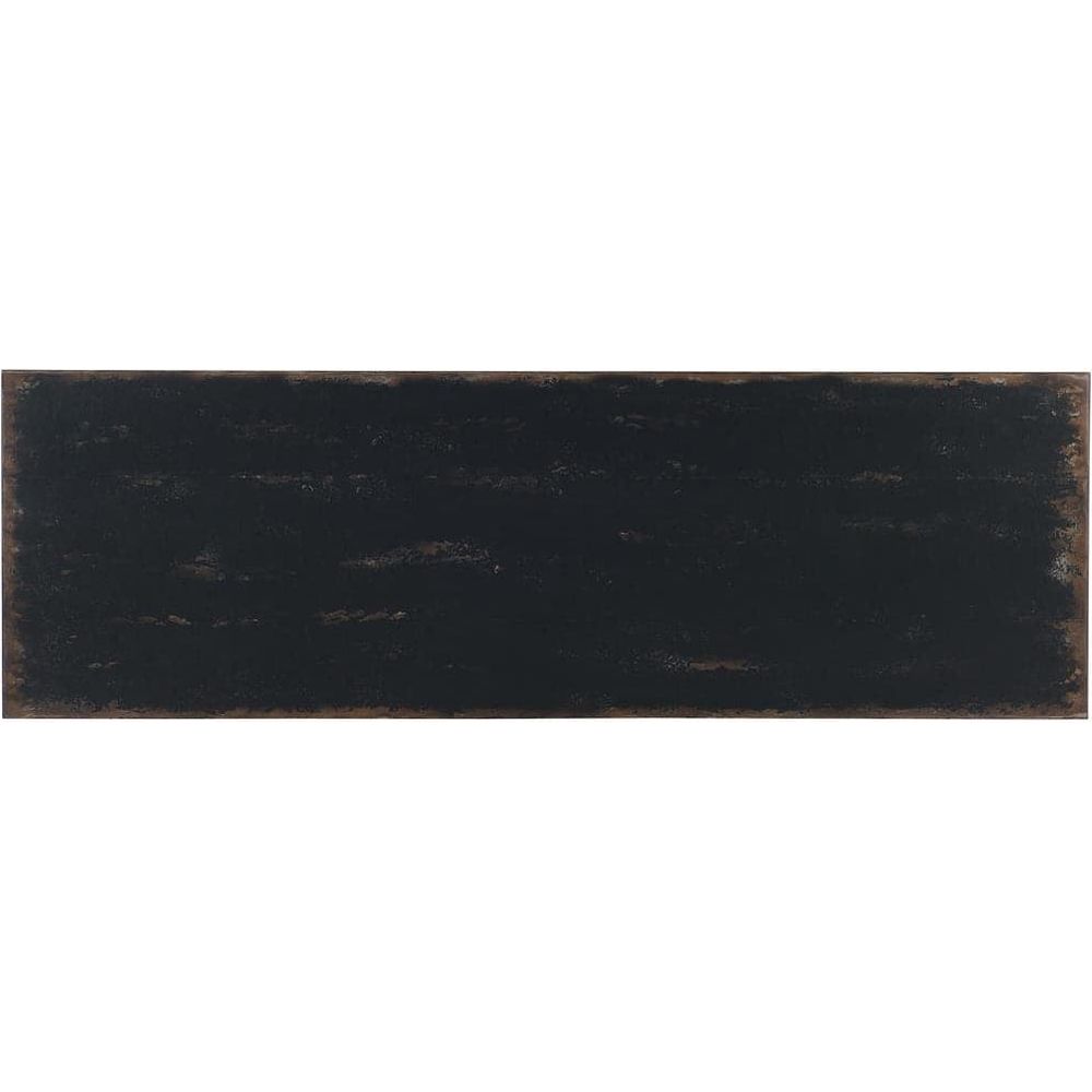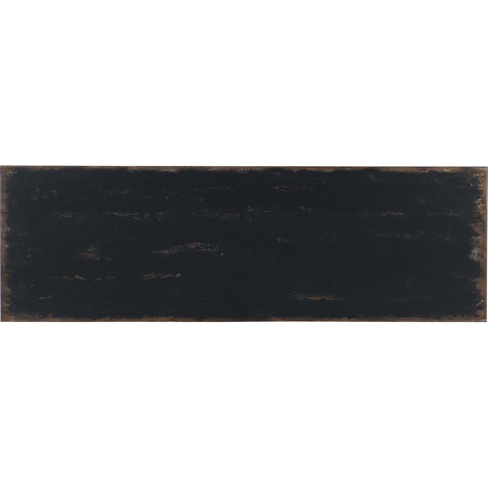 - Black finish. Distressing includes worm holes, rasping, multi-layer rub through and emulsion. Burnished brass hardware.