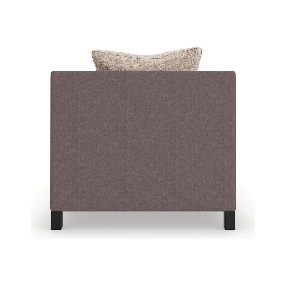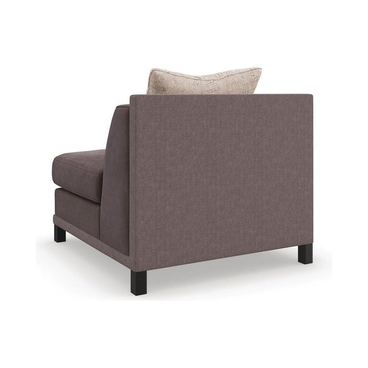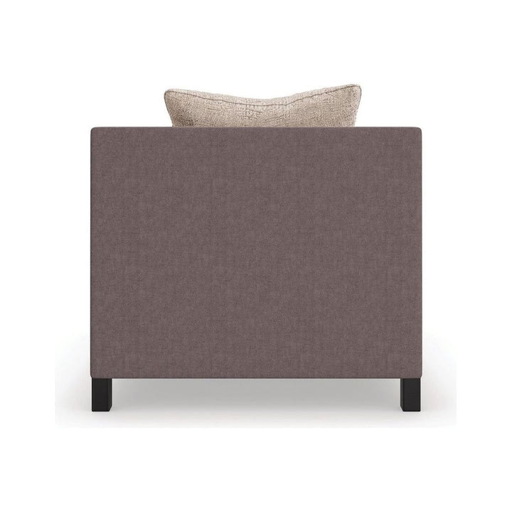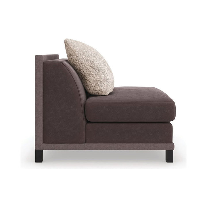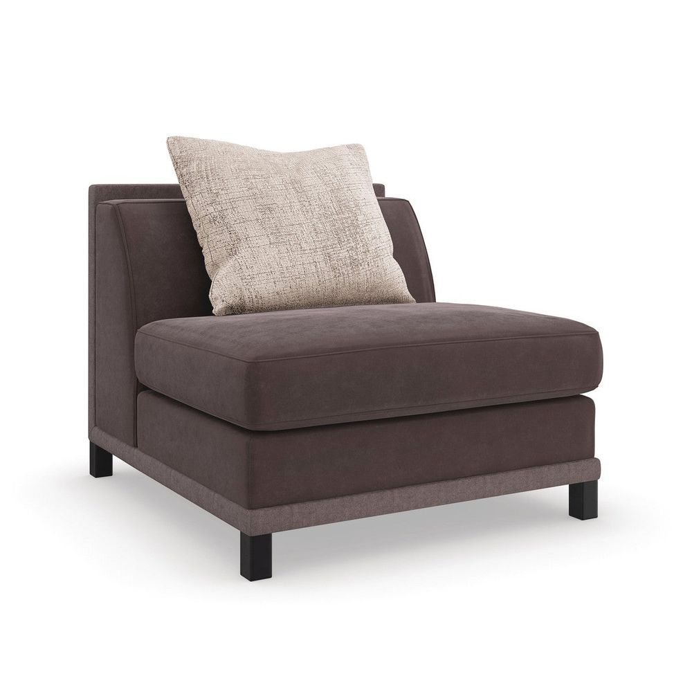 A fashionable component of our classic shelter arm sectional, with clean lines and crisp tailoring in a deep chocolate brown hue inspired by modern takes on the iconic tuxedo. Impeccably dressed, its sophisticated silhouette is punctuated by a luxe faux mohair fabric on the inside, and a textured woven fabric wrapping the back. Metal legs in brushed deep bronze add warmth and a dashing finish, complemented by accentuating toss pillows in a tactile mix.