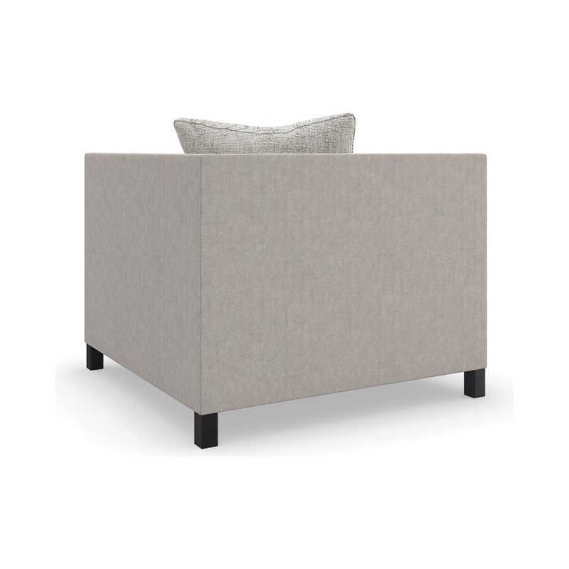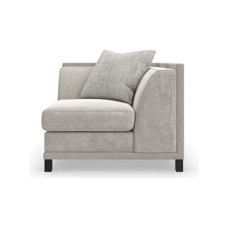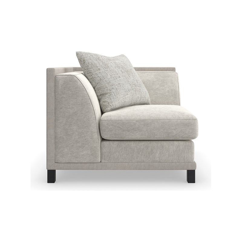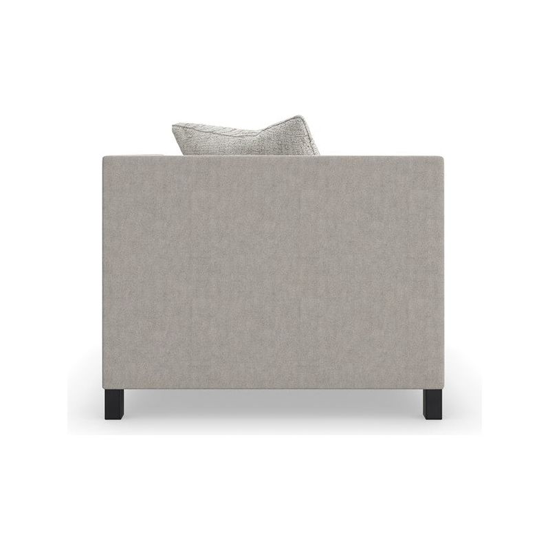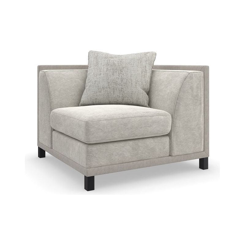 A fashionable component of our classic shelter arm sectional, with clean lines and crisp tailoring in a fresh neutral colorway. Impeccably dressed, its sophisticated silhouette is punctuated by a faux mohair opal fabric on the inside, and a textured woven wrapping the back. Metal legs in brushed deep bronze add warmth and a dashing finish, complemented by accentuating toss pillows in a tactile tonal mix.