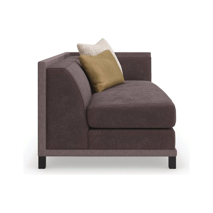 A fashionable component of our classic shelter arm sectional, with clean lines and crisp tailoring in a deep chocolate brown hue inspired by modern takes on the iconic tuxedo. Impeccably dressed, its sophisticated silhouette is punctuated by a luxe faux mohair fabric on the inside, and a textured woven fabric wrapping the back. Metal legs in brushed deep bronze add warmth and a dashing finish, complemented by accentuating toss pillows in a tactile mix.