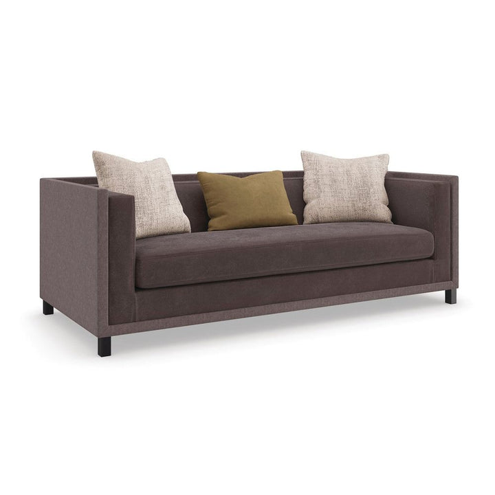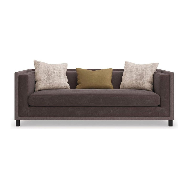 With clean lines and crisp tailoring in a deep chocolate brown hue, this classic shelter arm sofa is inspired by modern takes on the iconic tuxedo. Impeccably dressed, its confident silhouette is punctuated by a luxe mohair fabric on the inside arms, bench seat, and back cushion, with a textured woven linen wrapping the sides and back. Metal legs in brushed deep bronze add warmth and a dashing finish, complemented by a bronze faux mohair toss pillow.