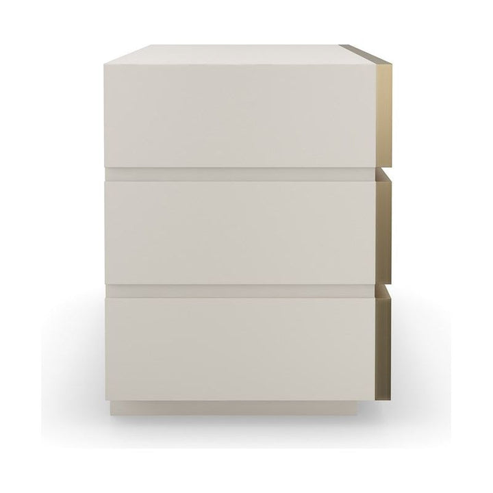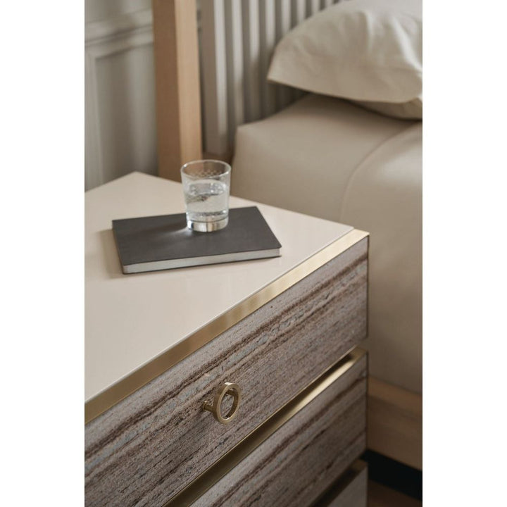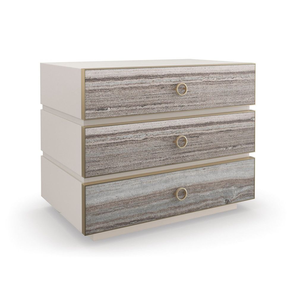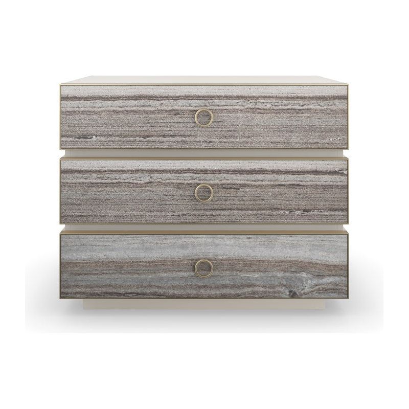 Grounding the room with a soulful sophistication, the Bedrock nightstand introduces a compelling mix of texture and material. Drawer fronts are crafted from polished gray sandstone, minimally adorned with metal trim and small ring pulls in Champagne Gold. Softly contrasted by a creamy Almond Milk finish, its intricate banding and natural color variations create an organic yet elegant aesthetic in any space.