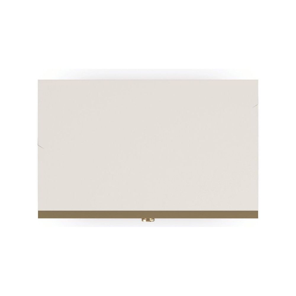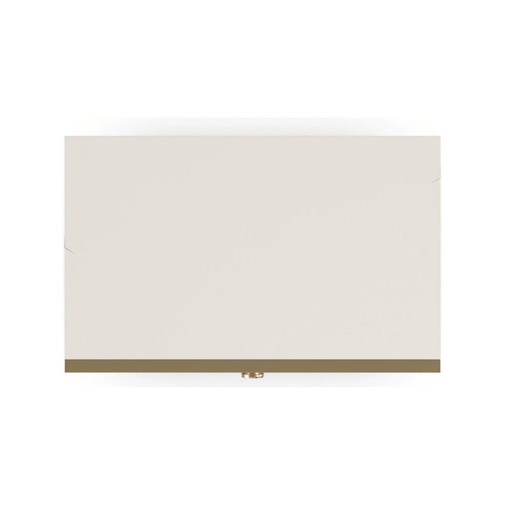 Features: Case finished in Almond Milk.Three stone front drawers in gray sandstone with metal trim in Champagne Gold and undermount guides.Plinth base finished in Almond Milk.Drawer interior in Almond Milk.