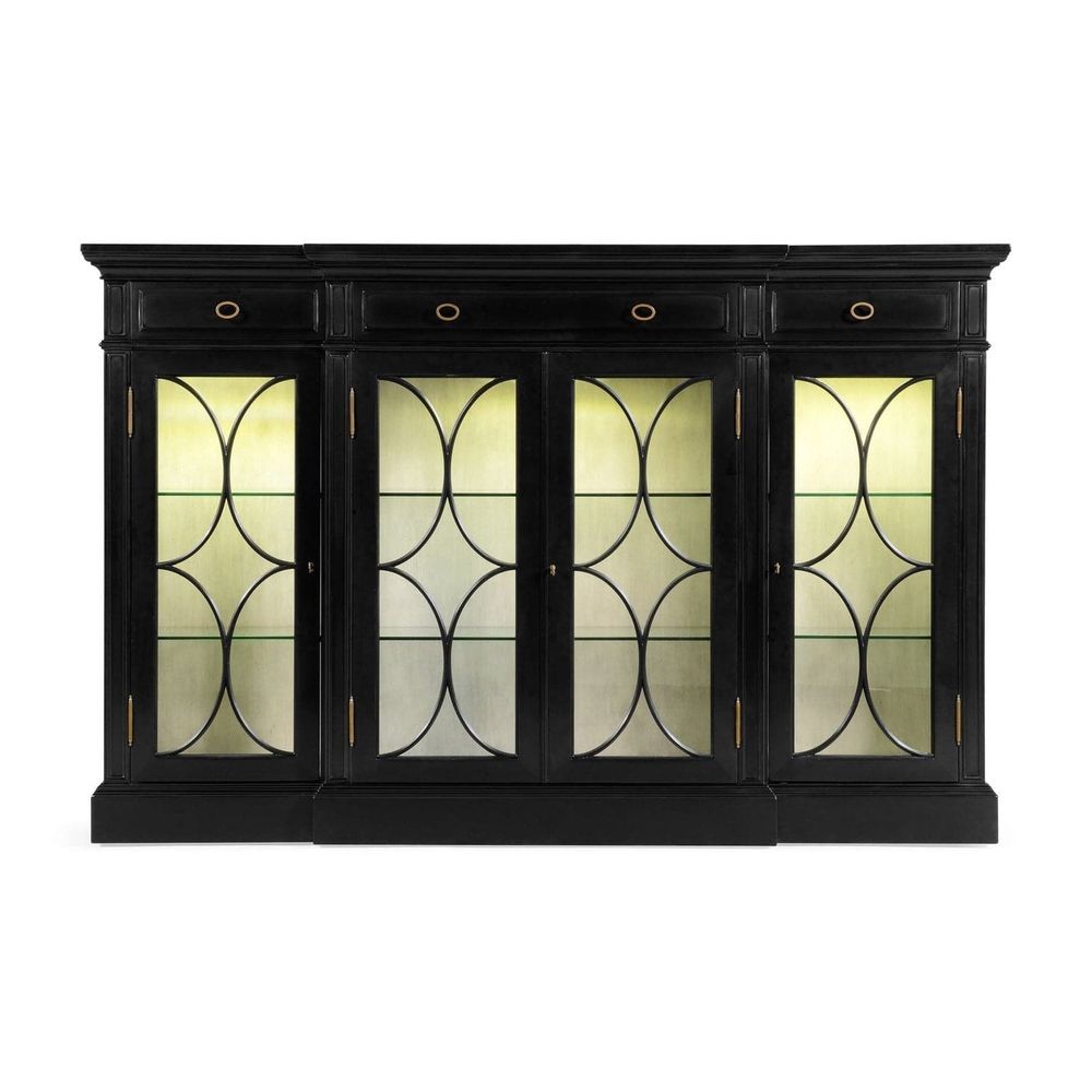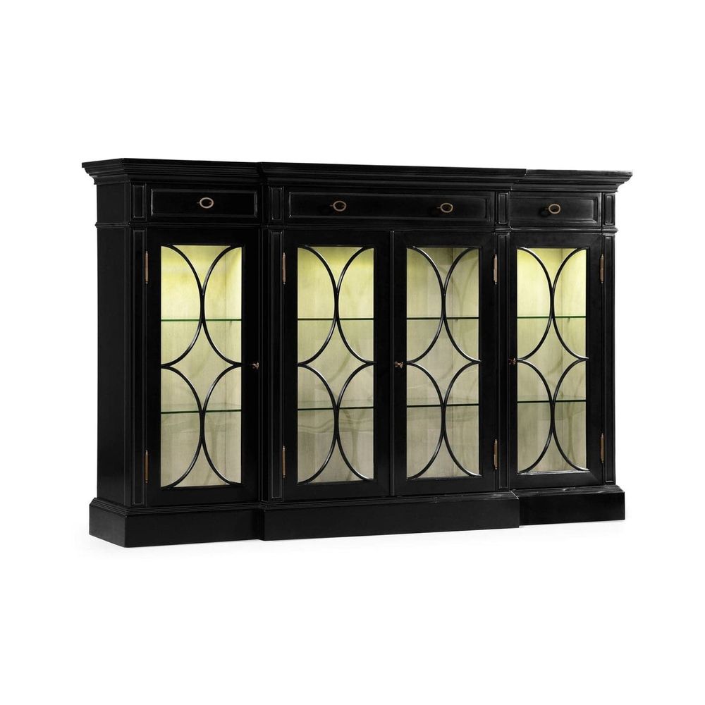 Black painted four door breakfront display cabinet with grey painted interior and LED Interiror lighting, the glazed doors flanked. Three shallow drawers to the top with brass handles.
