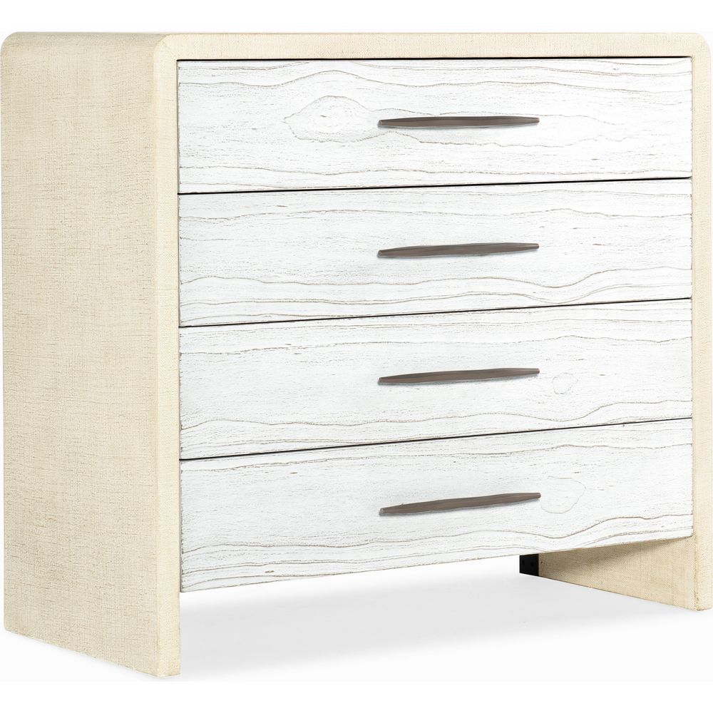 - Finish:Whites/Creams/Beiges,Outside of case: Pebble Beach: lacquered burlap finish. Drawer fronts: Chalk: cast resin in a soft, white finish. Champagne colored bar pull hardware.