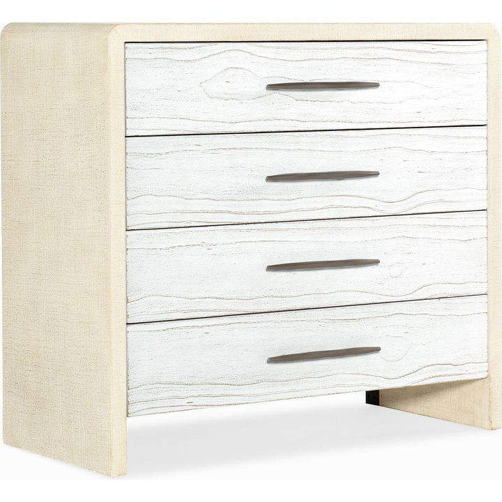 Just breathe and infuse your space with calm and tranquility with the two-tone Cascade Bachelor Chest blending a serene palette of whites, creams and taupe. The outside of the case is finished in lacquered burlap in a pebble color, while the drawer fronts are in a chalk-colored cast resin. Four self-closing drawers. The top drawer has a removable felt lining and the bottom drawer is cedar-lined. Designed to interject a sense of calm and tranquility into interior spaces, the Cascade Collection creates an elegant - yet livable - retreat from our modern day, fast-paced lifestyles. Characterized by its light and airy neutral color palette and use of mixed materials including oak, lacquered burlap, metal accents and champagne-tone hardware, the collection's modern styling can easily find its way into a variety of interiors across the country. As soothing as water falling from a steep rocky slope, the Cascade Collection was designed to spark Zen, tranquility and calmness in any living space.
