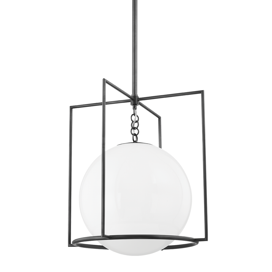 Description: A study in contrasts, Frankie plays with positive and negative space and geometry. A large opal shiny globe hangs within a square cage of aged brass, old bronze or polished nickel. The fixture is perfectly balanced, yet fascinating to look at-the globe appears to float above the ring at the bottom. Frankie is sure to draw the eye and make a statement.