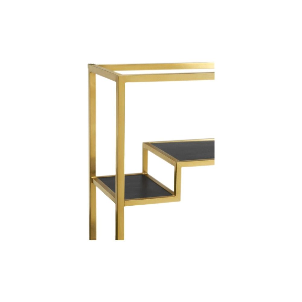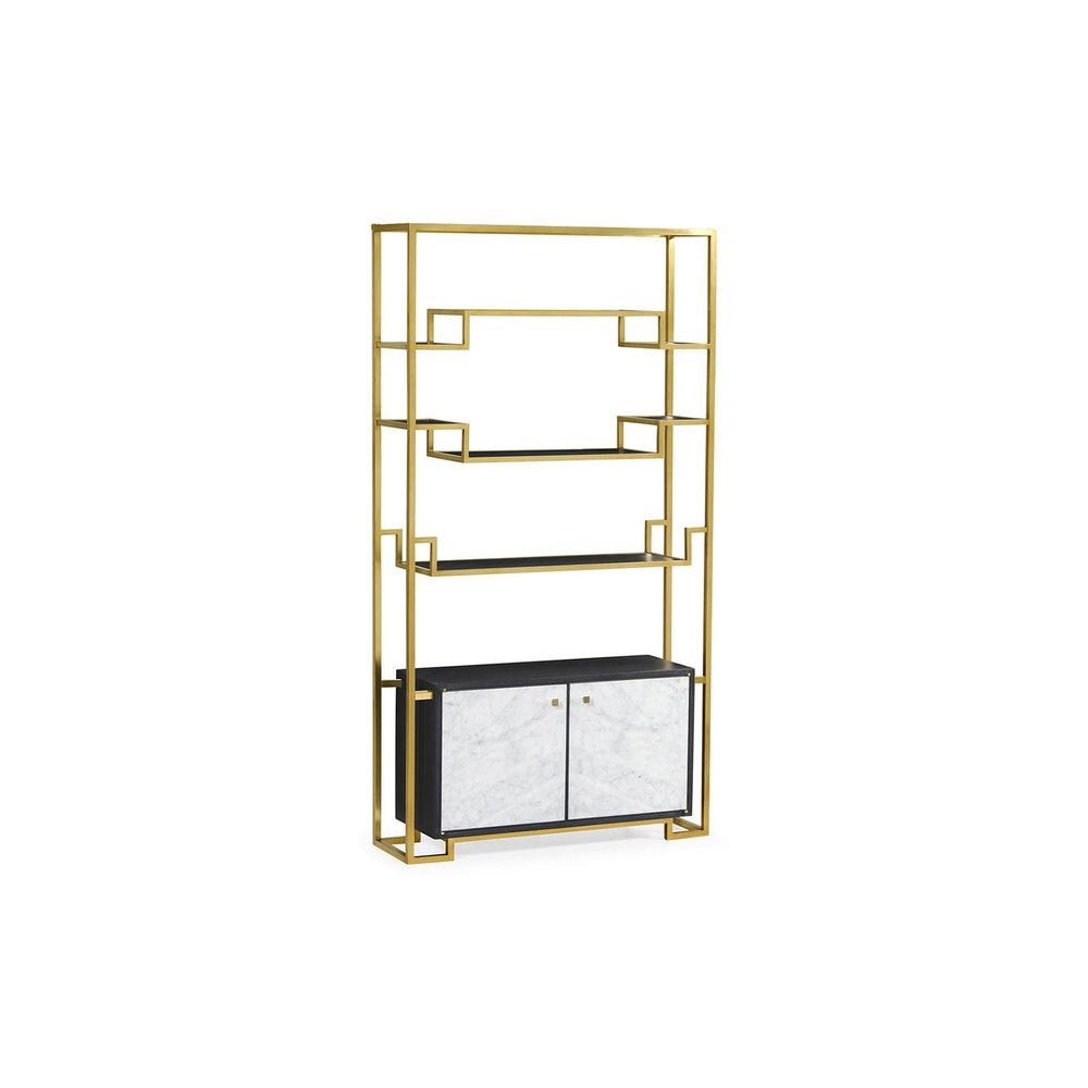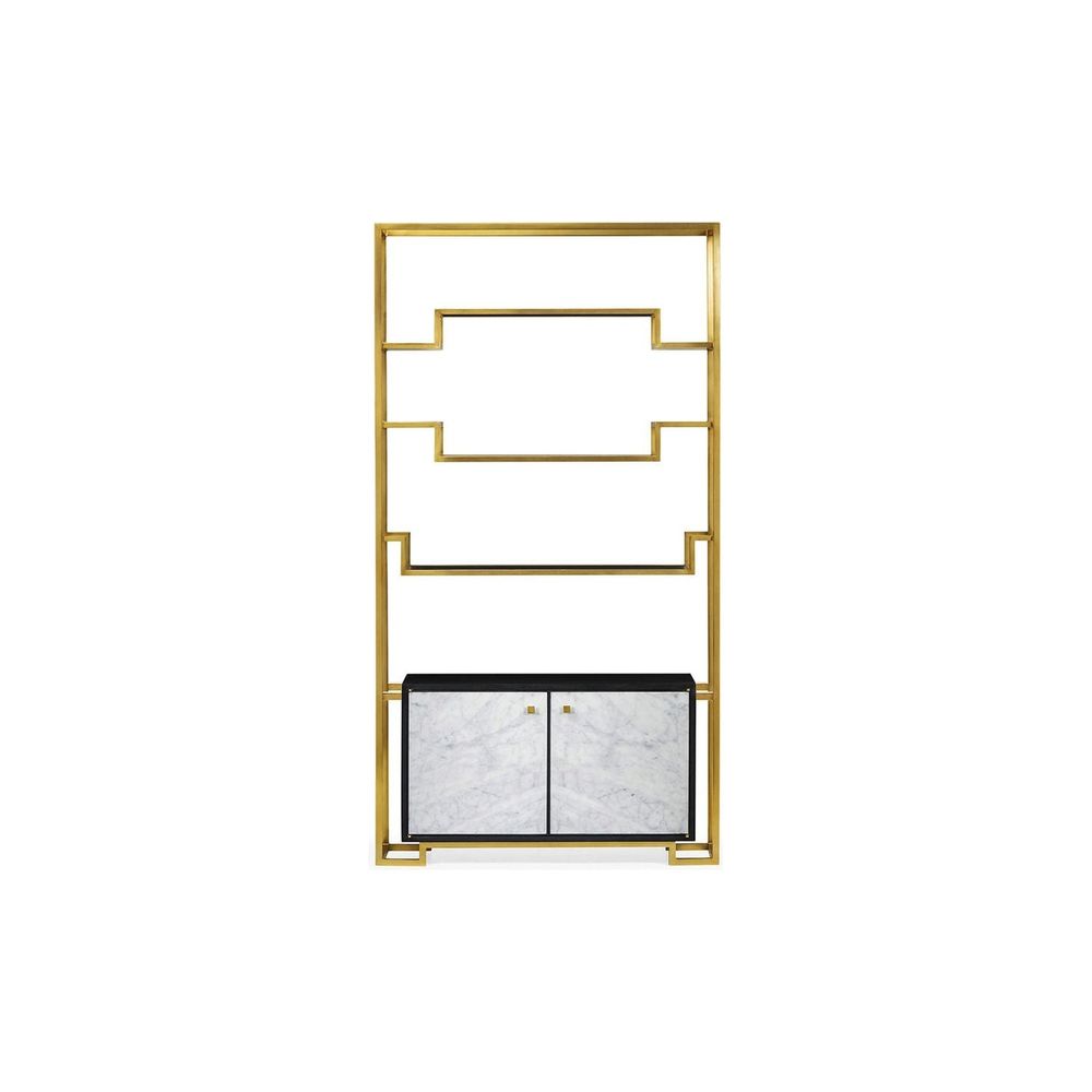 Frame is constructed of brass with a satin finish. Shelf inserts are oak with an ebonized finish. Cabinet features Calacatta marble doors with satin brass hardware. Interior includes one adjustable shelf.