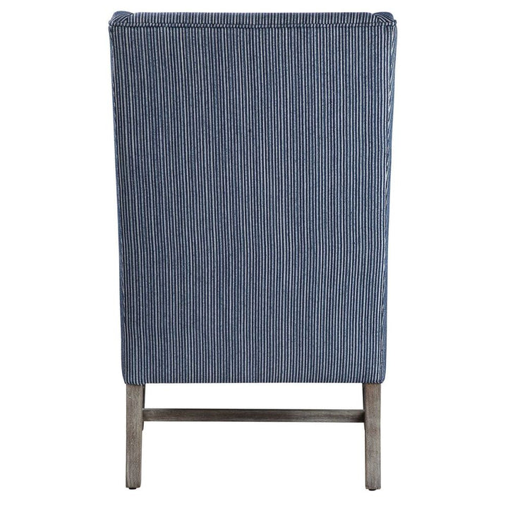 Showcasing a classic wingback style with a coastal feel, this accent chair features a blue and white organically striped fabric, resting on naturally finished solid wood legs. Seat height is 19".
