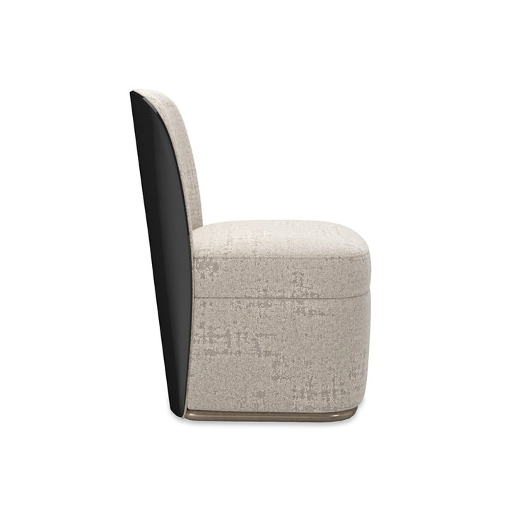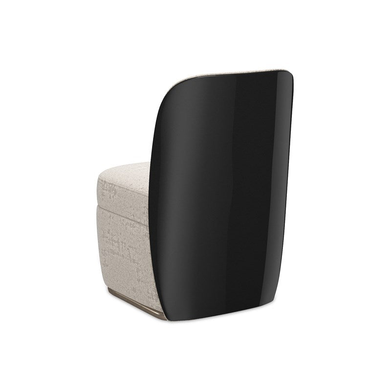 The Cabochon is a slipper chair that works as well when paired with a desk, as it does as a stand-alone side chair in a bedroom. Originally invented in the Victorian era, this curvaceous modern update has a high, rounded back and sits lower to the floor. The wooden oval outback is gently curved and finished in shiny Piano Black. The chair's interior back, tight seat and rounded base are upholstered in dreamy silver-taupe distressed chenille. The thin base is Charcoal Leaf and hides the casters for easy movement.