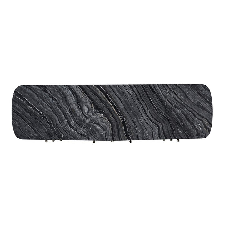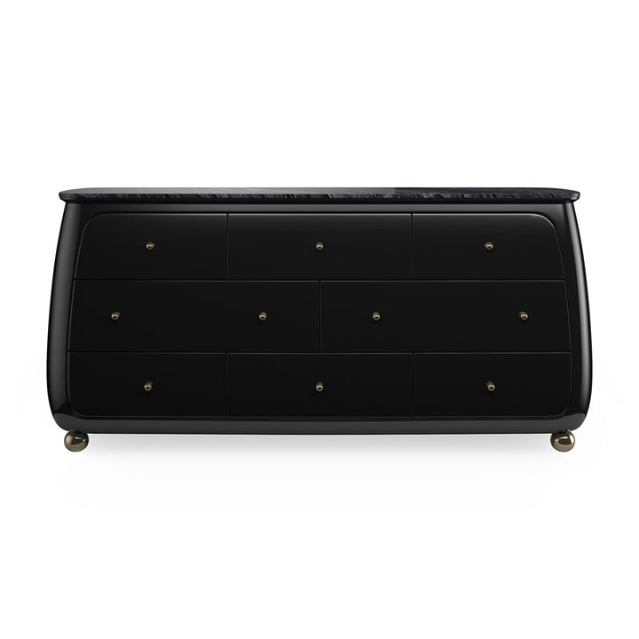 This gem of a dresser is elegance personified. A contemporized version of a classic Bombay chest, its sleek, rounded, piano-black frame is topped with highly figured black and grey stone. Eight soft-close drawers are curved to accentuate the sensuous nature of the piece. The final touches of Whisper of Gold spherical knobs and metal ball feet make this a piece to collect.