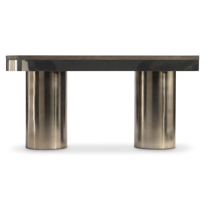 Oak table top in Weathered Greige finish, framed by polished stainless steel in Light Bronze finish and supported by two round polished stainless steel pedestals in Dark Bronze finish