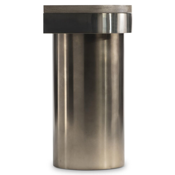 Description: A Dark Bronze finish makes a stunning statement on the round stainless steel legs of the Gentry console table. A metal band in Light Bronze finish wraps around the wire-brushed oak top, creating a stunning sculptural design of mixed materials.