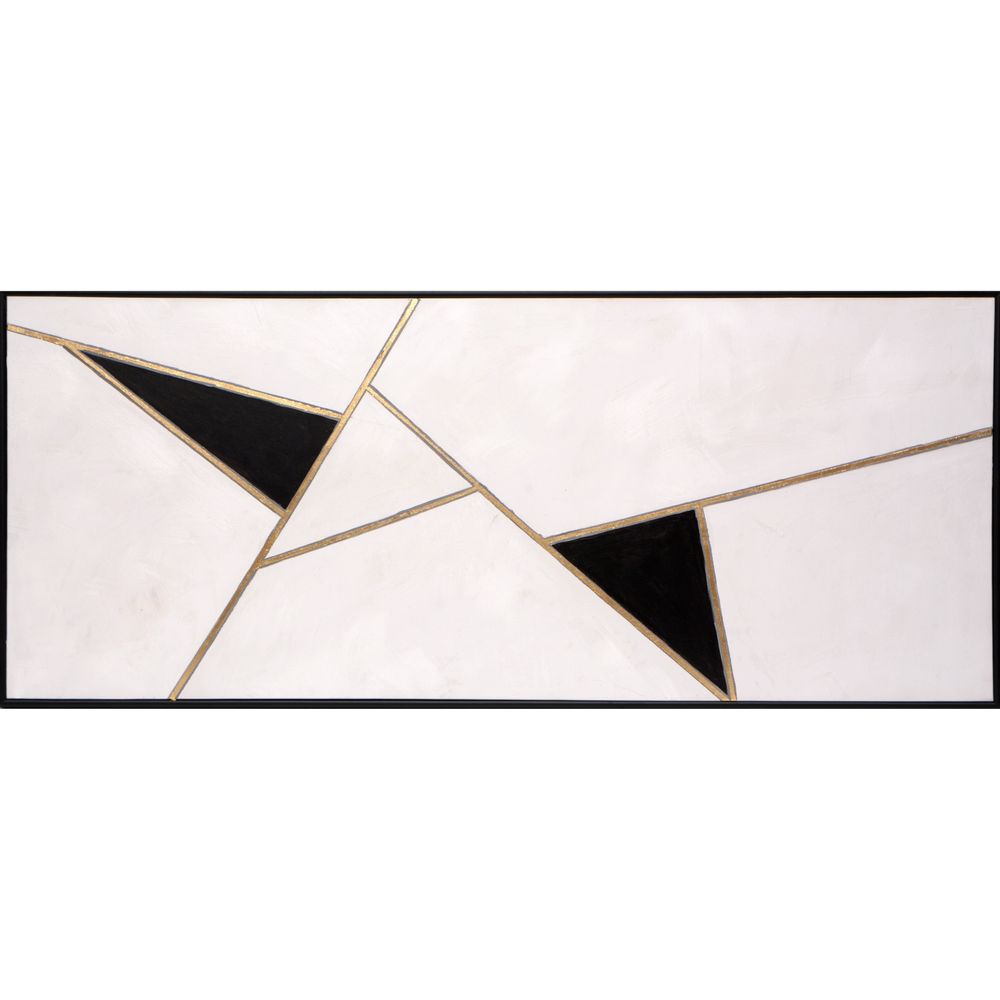 Description: This contemporary painting features a lively, geometric design of white, black and gold paint. Features a black finished wood floater frame. Each artwork is hand-painted and will feature slight variations that make every piece unique.