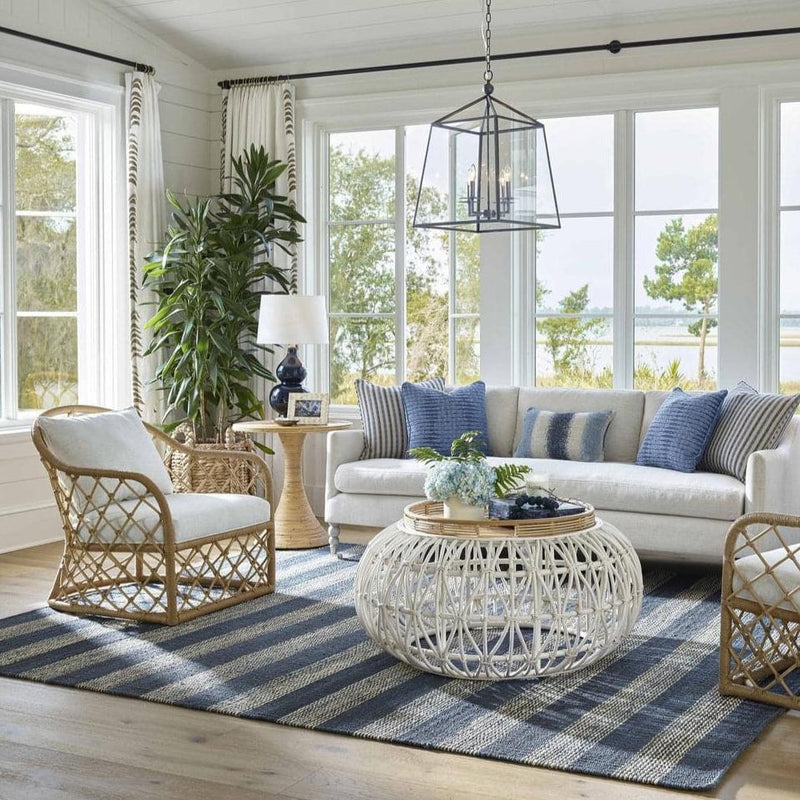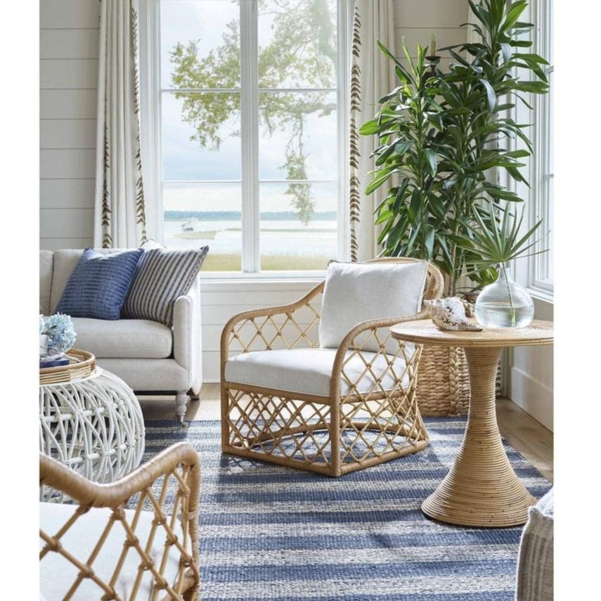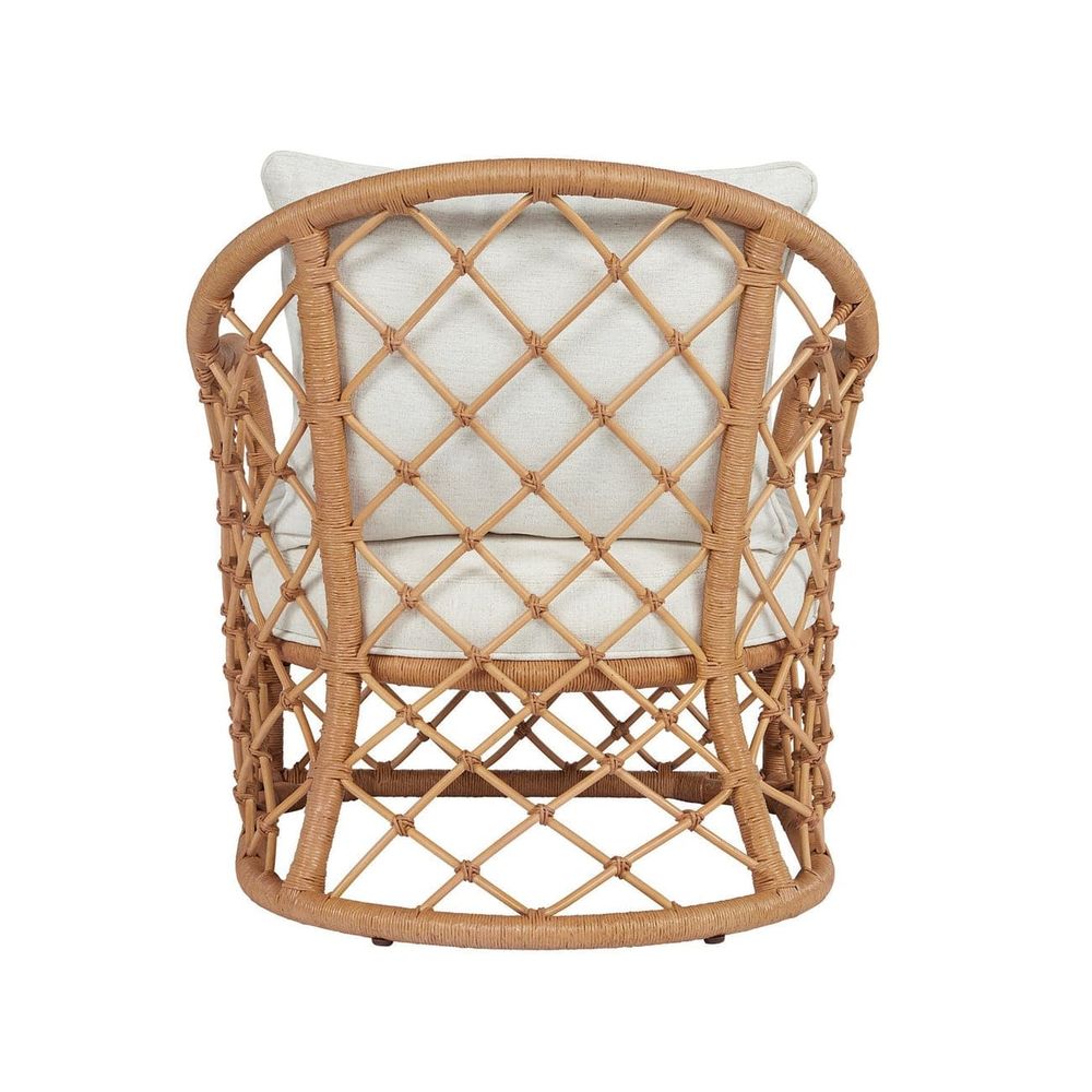 The Miramar Accent Chair features a comfy upholstered seat cradled by an earthy natural rattan body, promising coastal flair and ultimate relaxation.