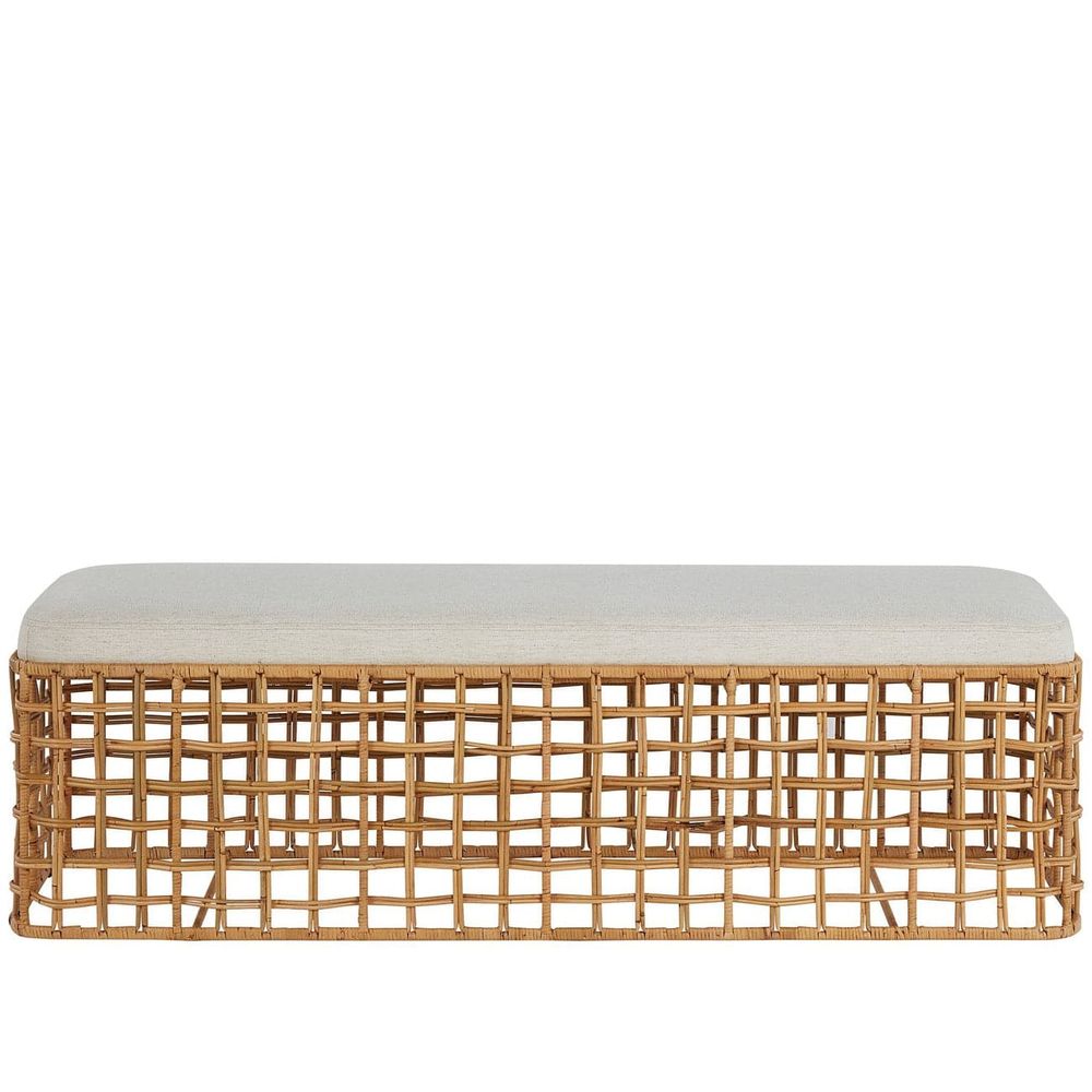 A full-bodied texture piece, the Rattan Bench features an interlaced wicker body with an upholstered seat, making it the perfect accent piece for bed-ends, hallways, and more.