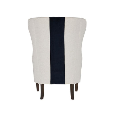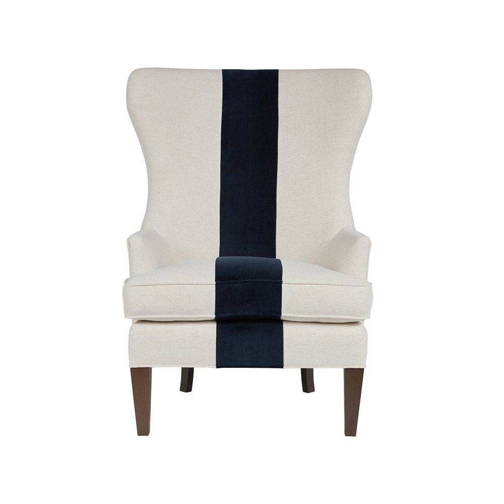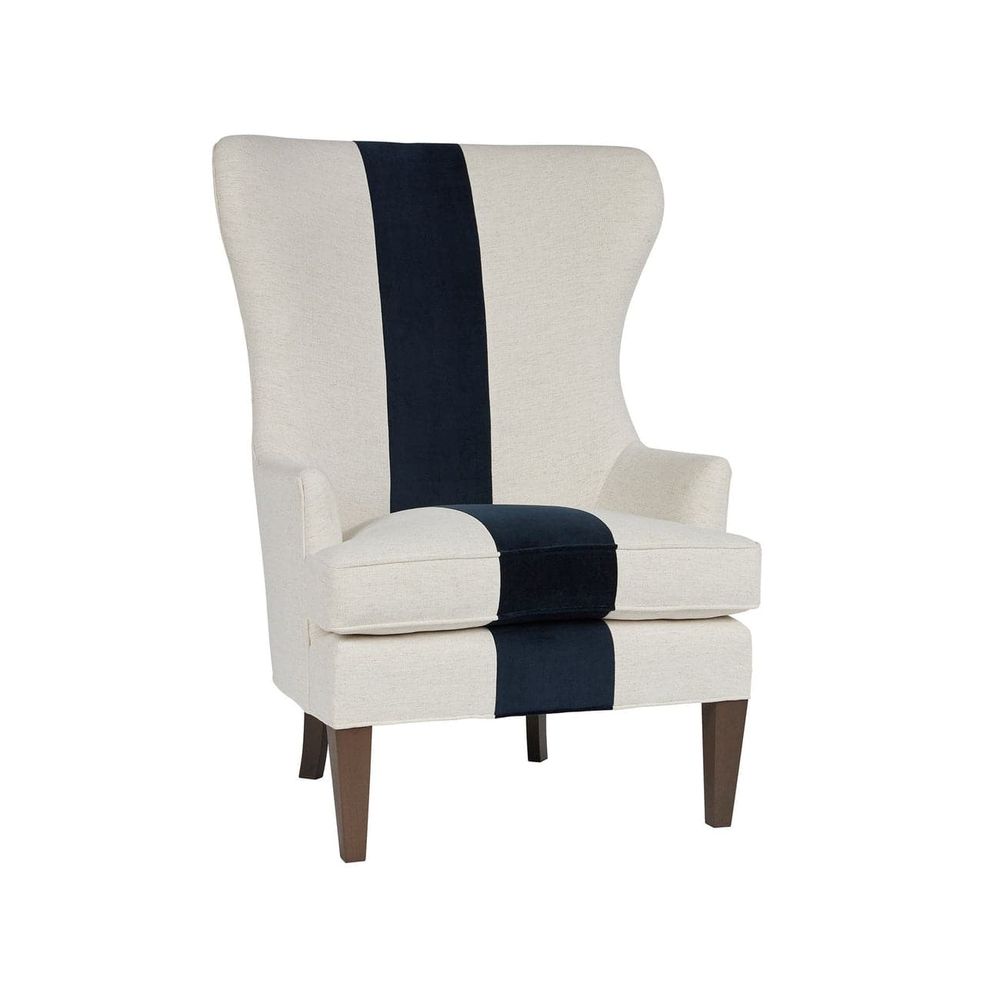 A daring, vertical navy stripe defines the Surfside Wing Chair, a regal upholstery furnishing featuring an exaggerated back and tapered legs.
