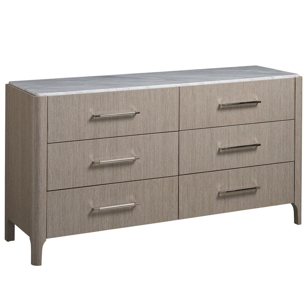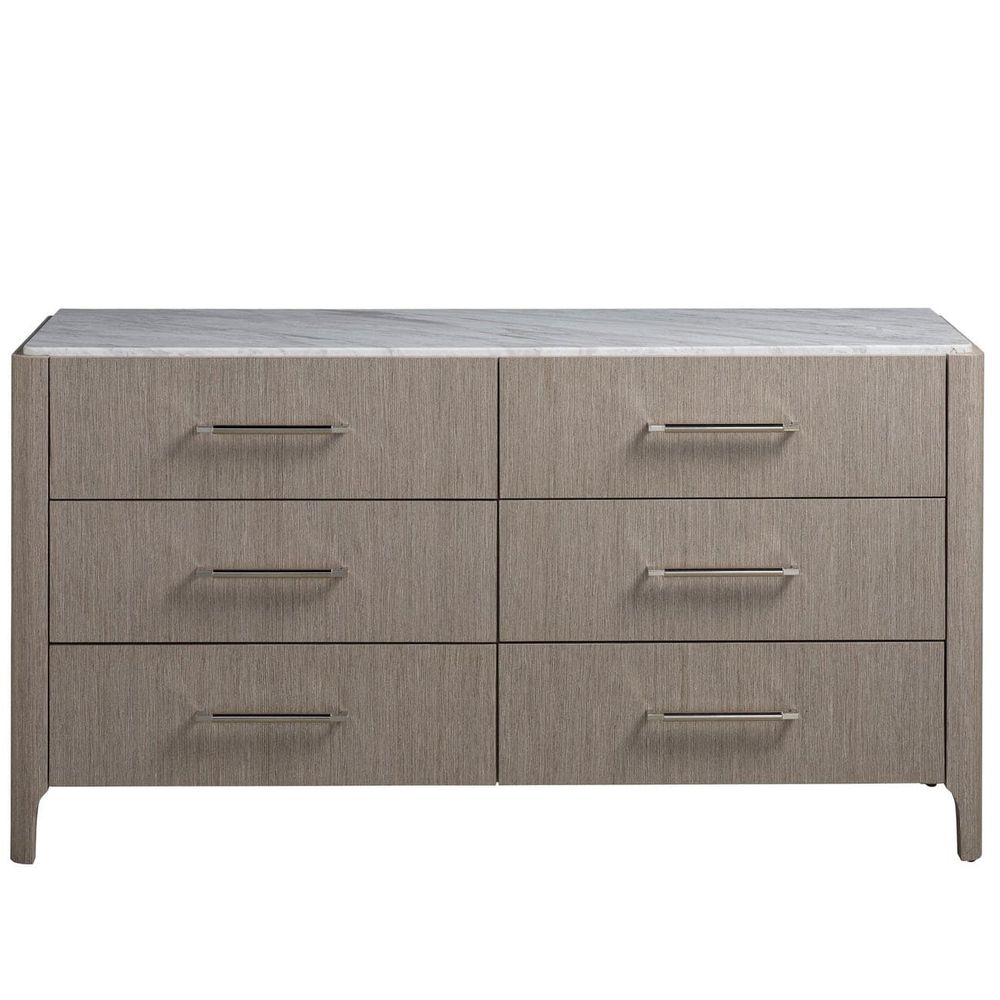 Add depth and intrigue to spaces with the Soren Dresser, a neutral-hued storage piece featuring a smooth stone top and six spacious drawers accented by sleek bar hardware.