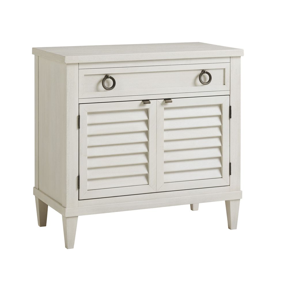 Feature 1: Plantation shutter influenced, the two louvered doors open to an adjustable shelf, with a drawer for storage, on tapered feet.