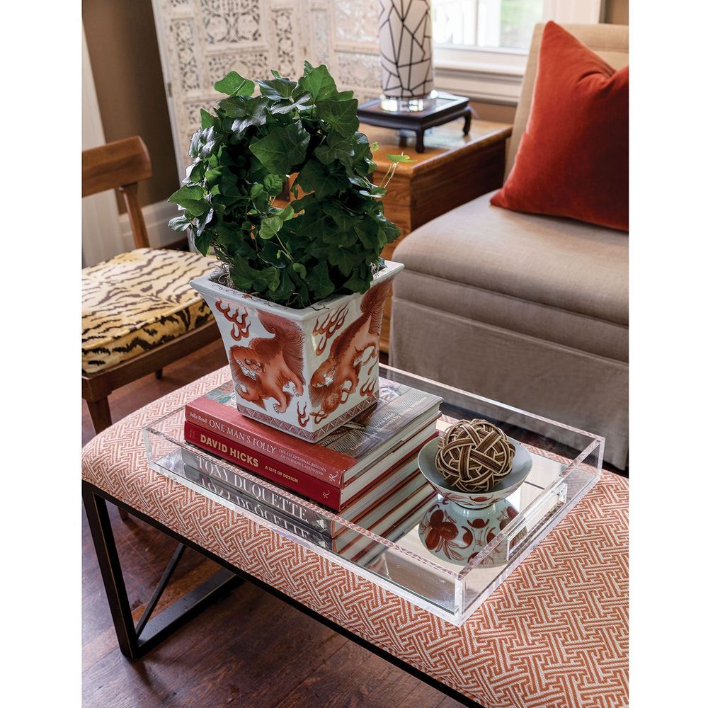 Our Glencoe tray features modern, transparent sophistication with polished, square lucite and a reflective mirror top. Velvet lined bottom to protect your surface. Rectangle shaped handles are cut into the lucite ends. So ever chic....it all appears like glass.