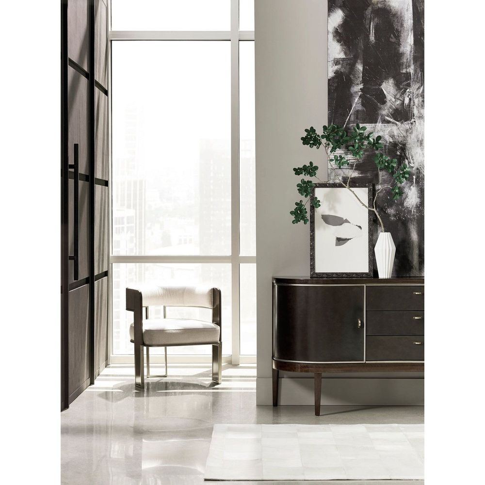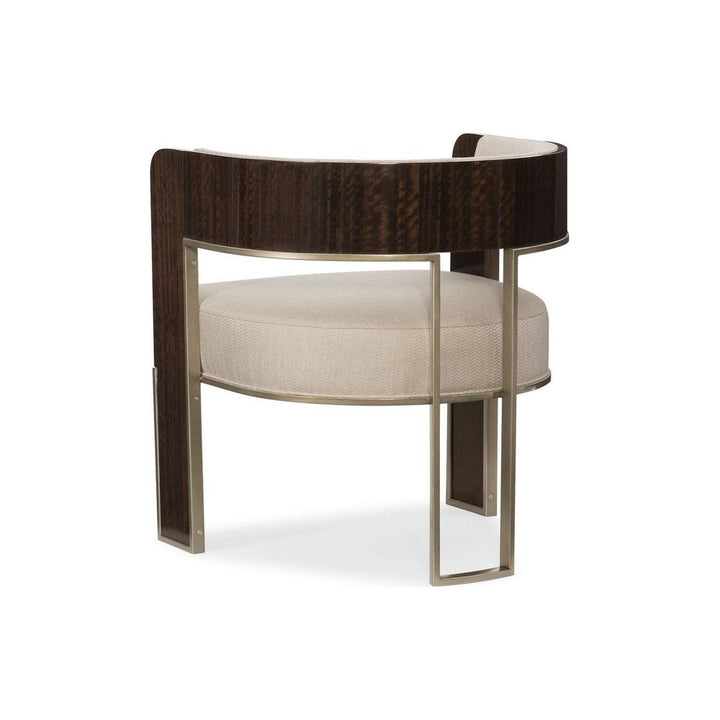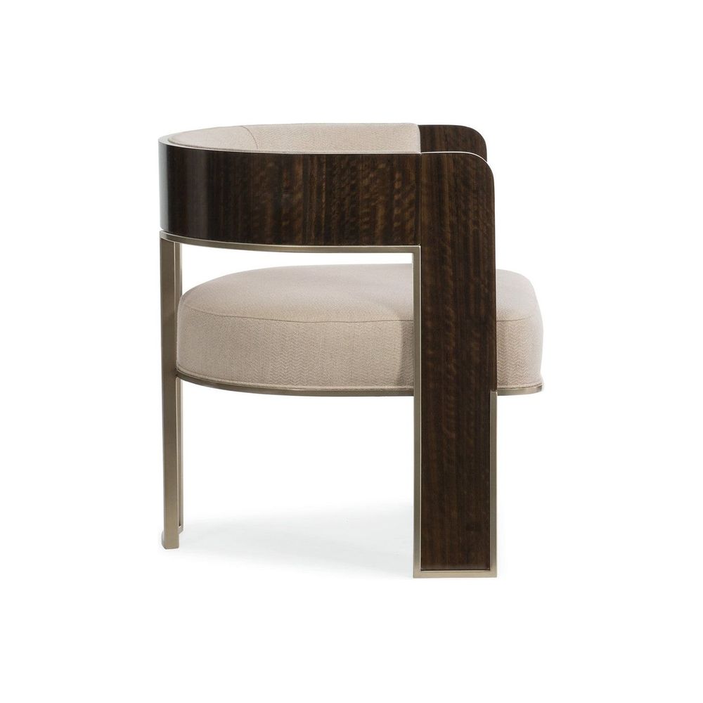 This open barrel-back chair is on the right track to becoming a future classic. The chair is suspended inside a half-moon-shaped frame of fumed figured eucalyptus wood, finished to a high sheen in Aged Bourbon. Thin Smoked Bronze metal legs support the back center of the chair and add style and stability. The inside back and tight seat are comfortably upholstered in a light cream vertical chevron fabric.