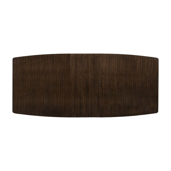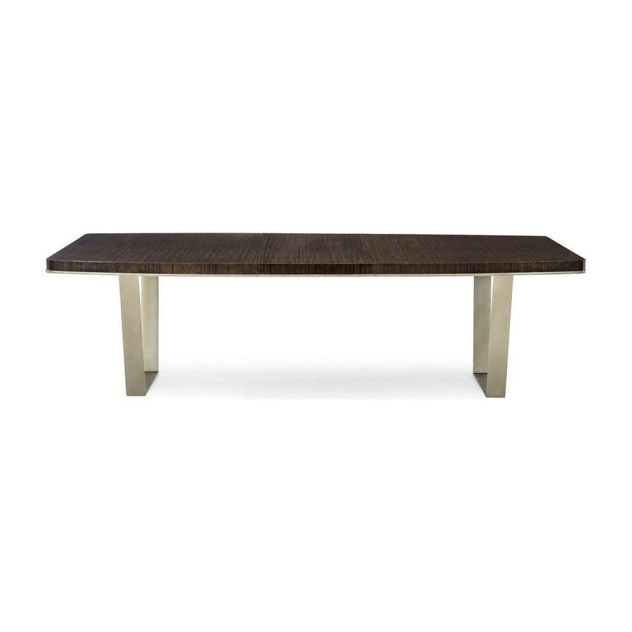 The memorable grain of fumed figured eucalyptus comes to life atop a dining table that is suspended by angled, contemporary metal braces. The wood's Aged Bourbon finish results in a commanding presence that can be expanded to easily seat 10 people. The accent molding is showcased in a band of Smoked Bronze that matches the sculptural metallic legs. The rounded rectangular shape of this table encourages conversation over a great meal.