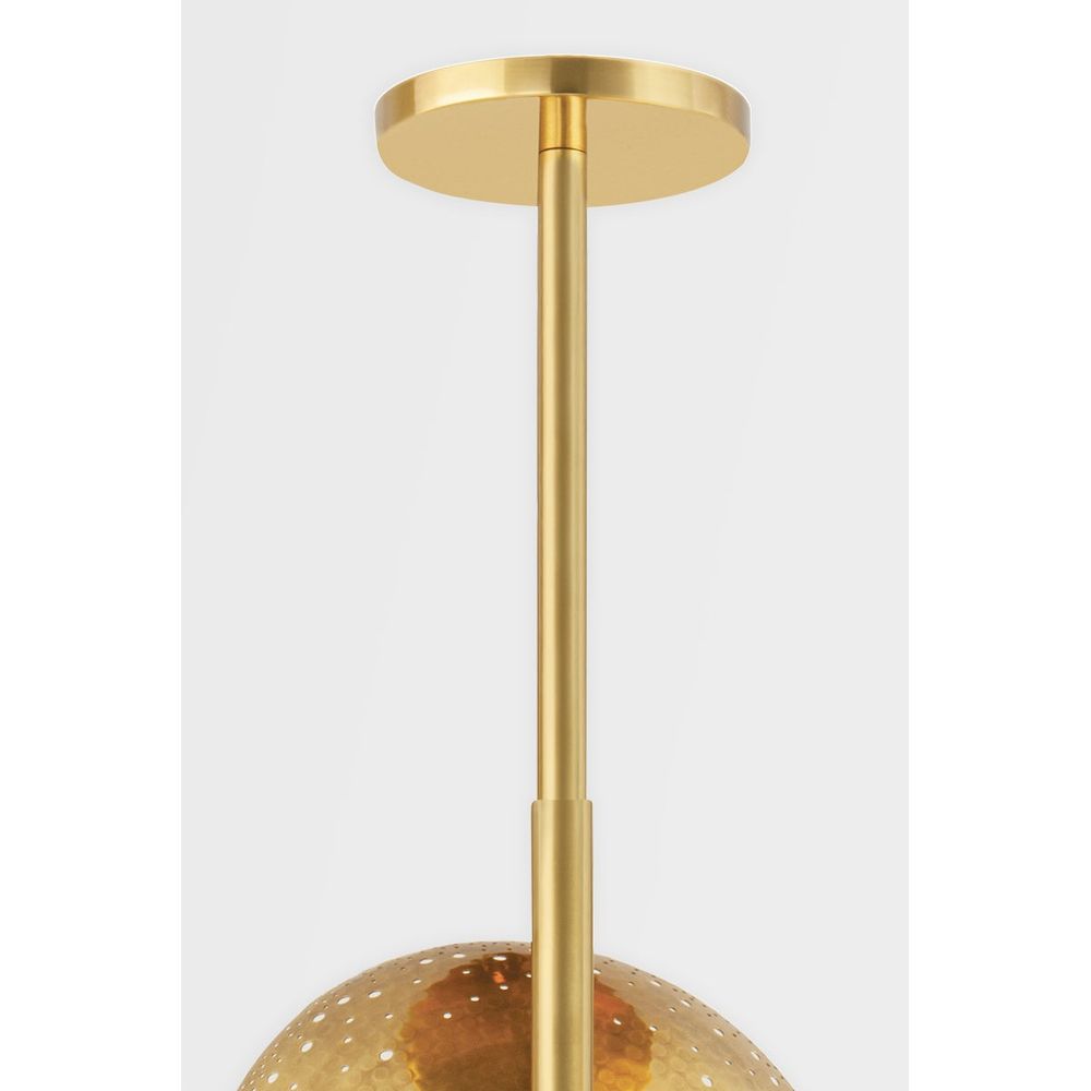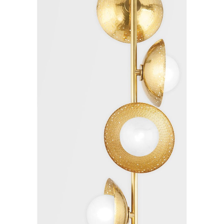 With perforated Aged Brass shades and clear globes etched on the inside, it's easy to see how Glimmer got its name. Light fills the glass and reflects beautifully off the metal while also seeping through the holes creating a stunning shimmer. The unique placement of the shades on the sconce, pendant, chandelier, and linear provide all-around light.