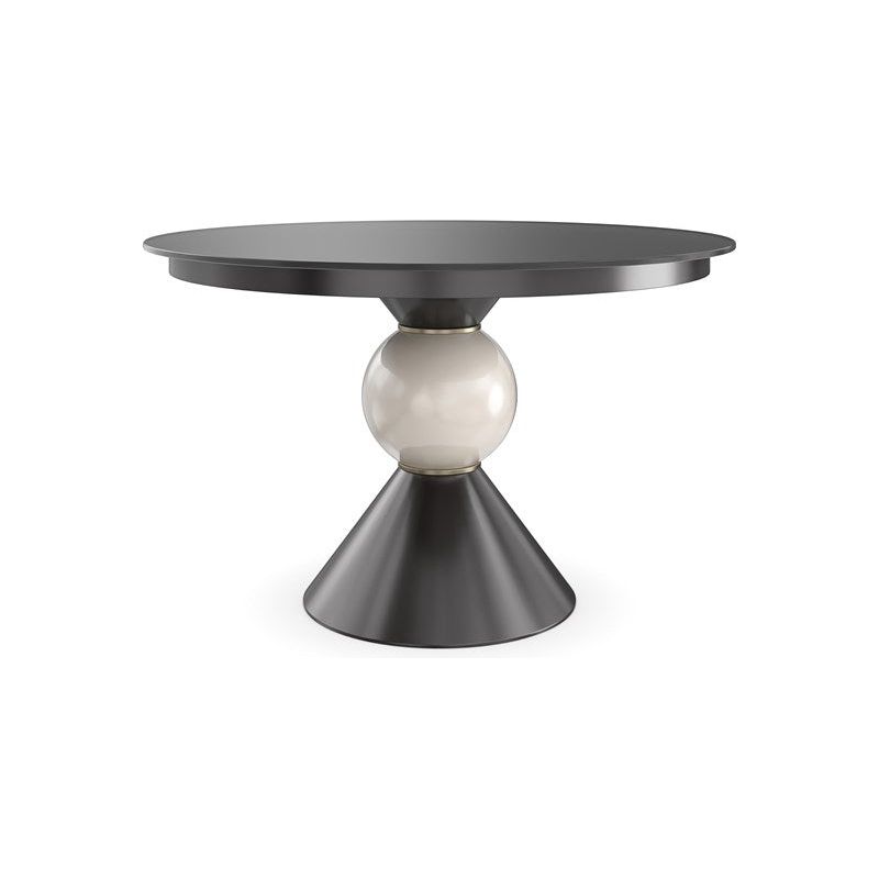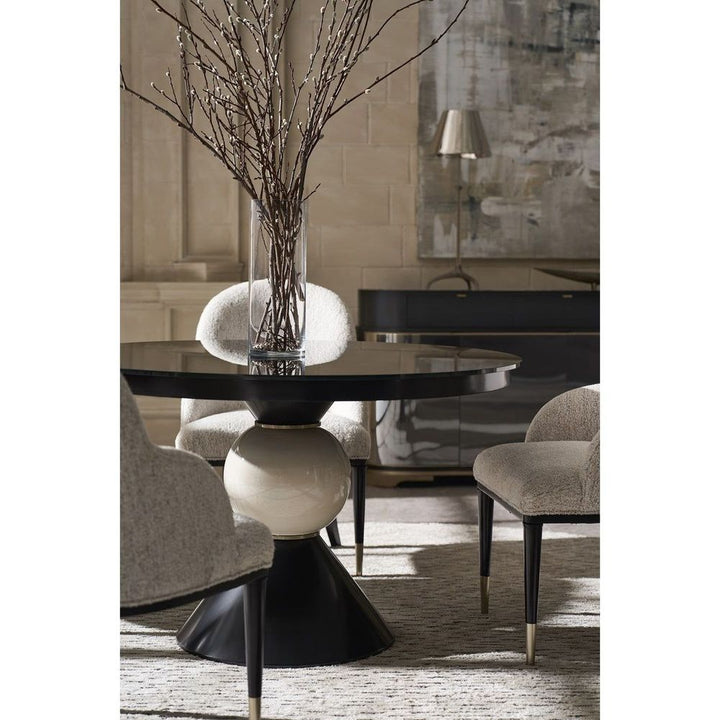 Perfect for intimate dining and smaller-scale settings, this classic round table draws attention with a simple yet sculptural base. A black glass top adds depth and reflection, beautifully balanced by a ceramic ball detail finished in a pearlescent glaze. Brushed Gold metal beading adds a hint of shimmer and sophisticated adornment.