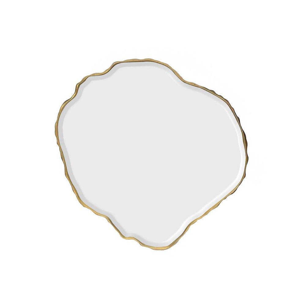 The Golden Ripples Mirror imbues an interior space with playful curves heightened through opulent flair. An asymmetric wooden frame showcases delicate ripples that are beautifully elevated by an exotic gold finish. The mirror is hung with french cleats and can be oriented in either landscape or portrait positions.