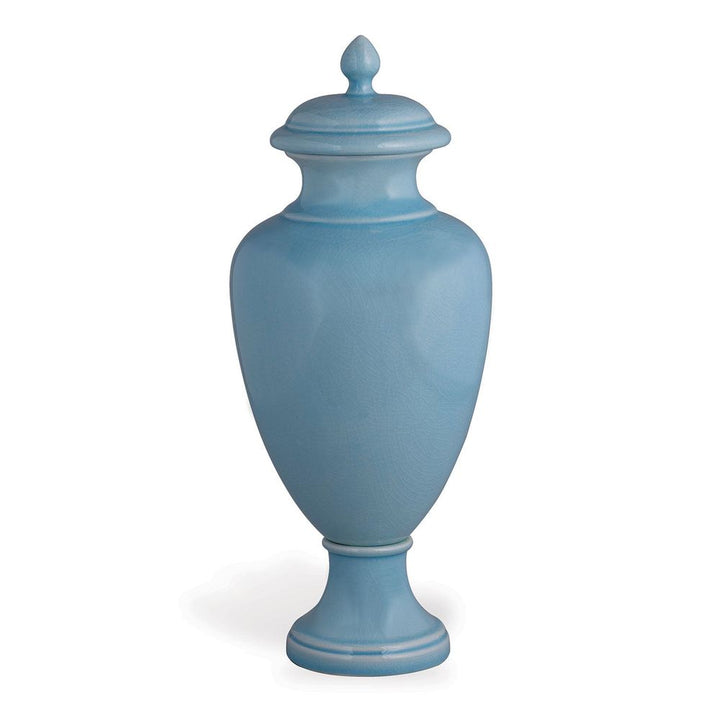 Greenwich is our modern shaped narrow jar with lift off lid. Translucent sky blue glaze.