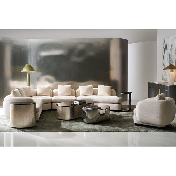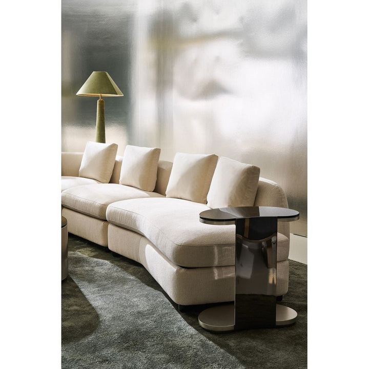 Inspired by Klimt's belief in the inseparable being of thing, these nesting tables are works of art from every angle. Their bean- and oval-shapes of varying sizes shine with Smoked Bronze glass on top, wide curved and spherical Deep Bronze metal legs, top and bottom wood panels dressed in Charcoal Leaf and a sleek plinth base in Almost black. Pair the tables together, or arrange them separately, they will make a statement either way.