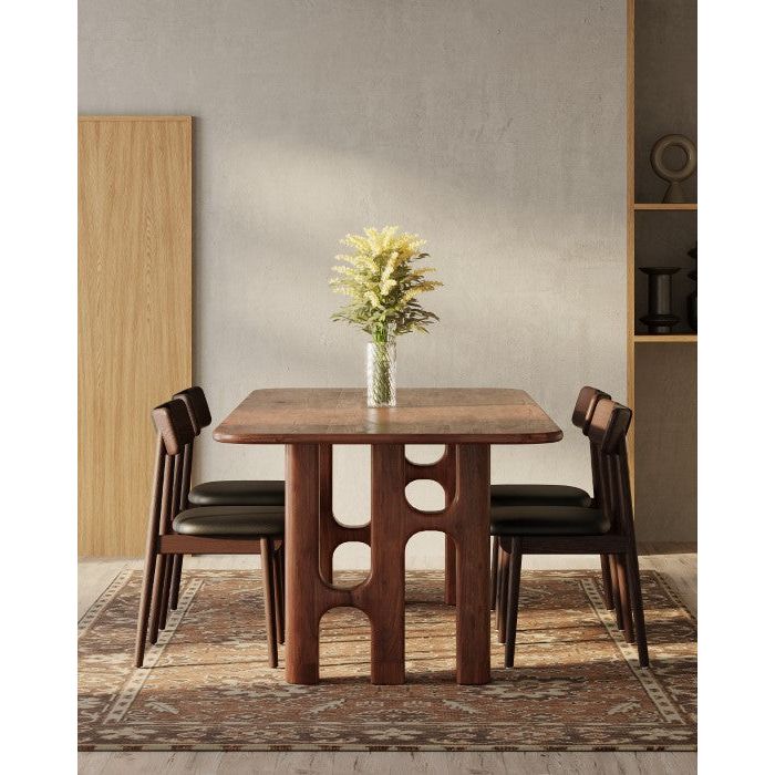 Description: Inspired by the coastal rock formations of southern Italy, the Grotto dining table adds a sculptural element to any dining space. Two carved, solid wood leg pedestals support a softly profiled wood top, finished in a warm, walnut stain.