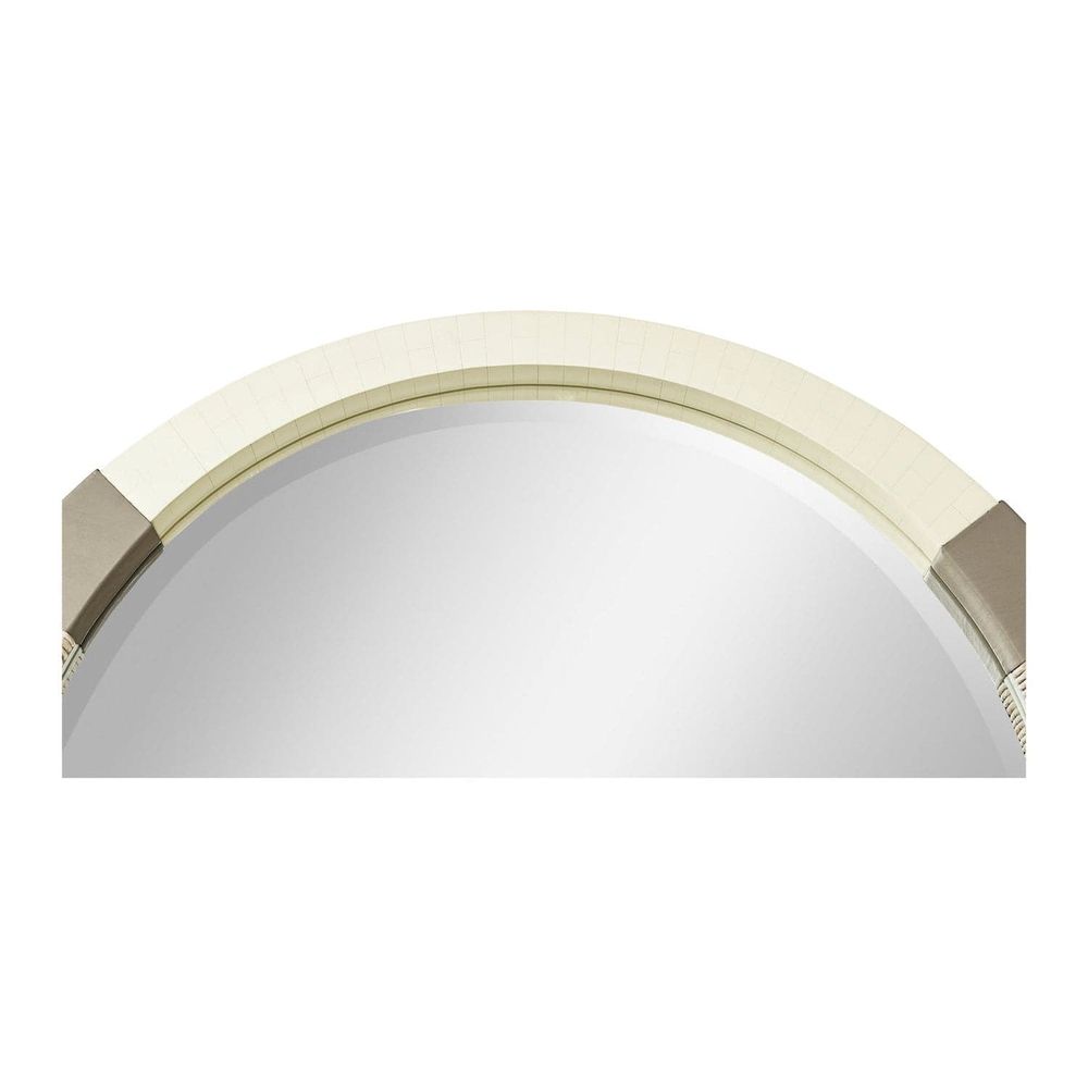 Showcasing a dazzling mix of eclectic materials, the Gyre multimedia mirror is wrapped in bone, whitewashed Danish cord and leather. At three feet wide, Gyre is a captivating and modestly-sized wall piece that demonstrates Jonathan Charles' visionary design and superior craftsmanship.